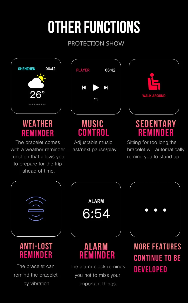 1. Модель продукта: B57 умный Браслет 2. Чип: NRF52832 3. Bluetooth: BT4.0 4. Совместимая система: Android 4,4 и выше, IOS 9,0 или выше 5. Водонепроницаемость: IP67 6. Экран: 1,3 дюйма IPS разрешение цвета: 240*240 7. Прикосновение: одно касание 8. Аккумулятор: 180 мАч 9. Зарядка: Магнитная Зарядка 10. Время зарядки: около 1,5 ч 11. Режим ожидания: 25 дней или около того Время работы: 7 дней или около того 12. Материал браслета: чехол из поликарбоната + пластиковый чехол 13. Размер изделия: около 48,9*34,5*11,7 мм/1,92*1,35*0,46 дюйма 14. Языки поддержки приложения: украинский, русский, немецкий, итальянский, японский, французский, упрощенный китайский, традиционный китайский, английский, португальский, Особенности: 1. Функция отображения браслета: отображение времени, отображение иконок батареи, отображение даты, отображение недели, стандартная функция движения (шаг, расстояние, калории) мультиспортивный режим (ходьба, бег, езда на велосипеде, пропуск, бадминтон, Баскетбол), футбол, плавание), пульс, обнаружение кровяного давления, обнаружение кислорода в крови, Отображение времени сна, регулировка яркости экрана, управление музыкой. 2. Функция напоминания: входящий вызов, SMS, QQ, напоминание WeChat (отображение содержимого и имени). Facebook, Whatsapp, Twitter, Skype и другие зарубежные напоминания о социальных приложениях, будильники (три набора будильников), напоминания о малоподвижности. 3. Другие функции: интеллектуальная защита от потери, дистанционное управление фотографией, режим не беспокоить, поднимите руку на яркий экран, настройка Формата времени, заводской сброс, длительное нажатие, чтобы отклонить входящие звонки, выбор интерфейса с тремя часами, управление музыкой (поддерживает предыдущую песню, следующую песню, воспроизведение/пауза), отображение погоды, здоровье apple и т. д. Пожалуйста, обратите внимание: Примечание: 1. После получения часов, пожалуйста, зарядите сначала. Потому что после длительного периода логистики часы имеют низкую батарею 2. Не используйте умный браслет в морской воде, горячей воде или теплой воде! 3. Носимые устройства отслеживают деятельность человека с помощью электронных датчиков, и они находятся на потребительском уровне. Это нормально для определенных отклонений. Пользователь должен рассматривать данные объективно. 4. Пожалуйста, не сравнивайте с больничным оборудованием для чтения, это не медицинское устройство! Пожалуйста, не покупайте для проверки здоровья (проблемы с сердцем, проблемы с кровяным давлением) Это не для профессионального использования. Просто может быть ссылка. Упаковочный лист: 1 * браслет 1 * Руководство по эксплуатации 1 * зарядный кабель