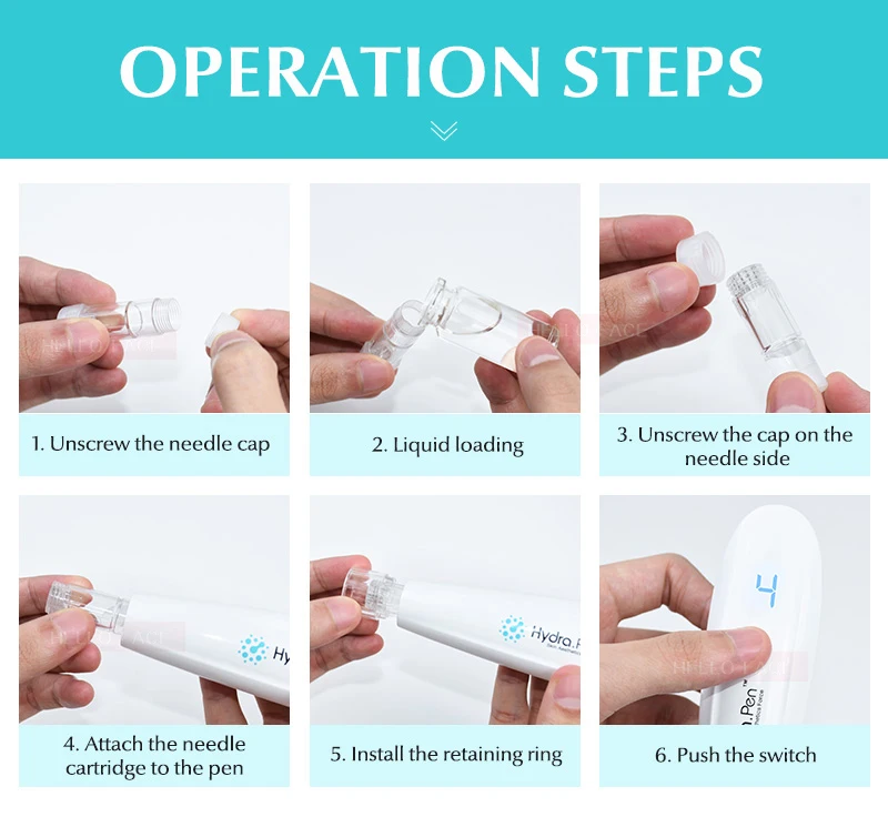 1. Поместите эссенцию в пустой картридж иглы 2. Поместите мягкую вилку в нижней части игольчатого картриджа 3. Снимите защитный чехол 4. Соберите игольчатый картридж в ручку Hydra 5. Соберите удерживающее кольцо в ручку hydra 6. Запустите ручку hydra. Нажмите кнопку питания for2-3 секунд, чтобы начать или выключить устройство начинается с медленной и быстрой скорости