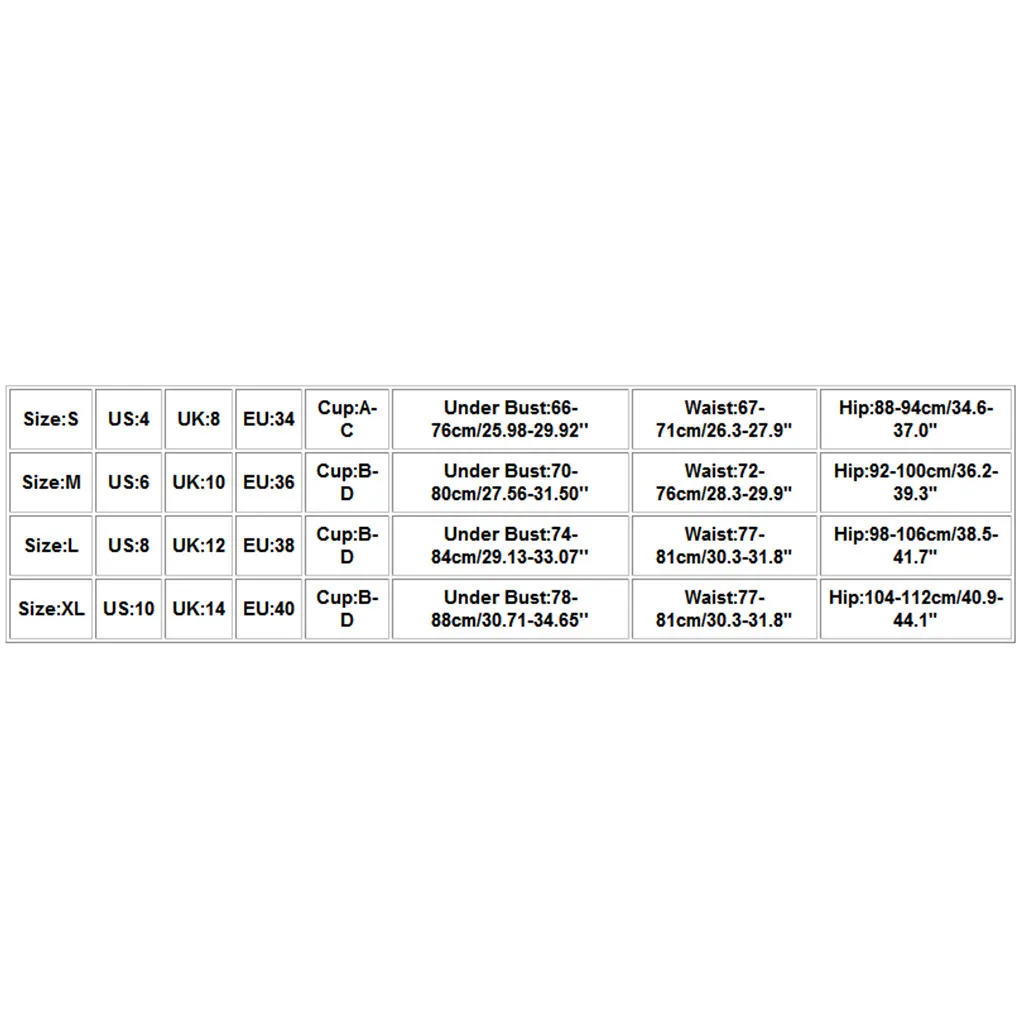 Размер США Великобритания ЕС Чашка Под грудью Талия Бедра S 4 8 34 A-C 66-76 см/25,98-29,92 дюйма 67-71 см/26,3-27,9" 88-94 см/34,6-37,0" М 6 10 36 B-D 70-80 см/27,56-31,50'' 72-76 см/28,3-29,9" 92-100 см/36,2-39,3" L 8 12 38 B-D 74-84 см/29,13-33,07'' 77-81 см/30,3-31,8" 98-106 см/38,5-41,7" XL 10 14 40 B-D 78-88 см/30,71-34,65'' 77-81 см/30,3-31,8" 104-112 см/40,9-44,1"