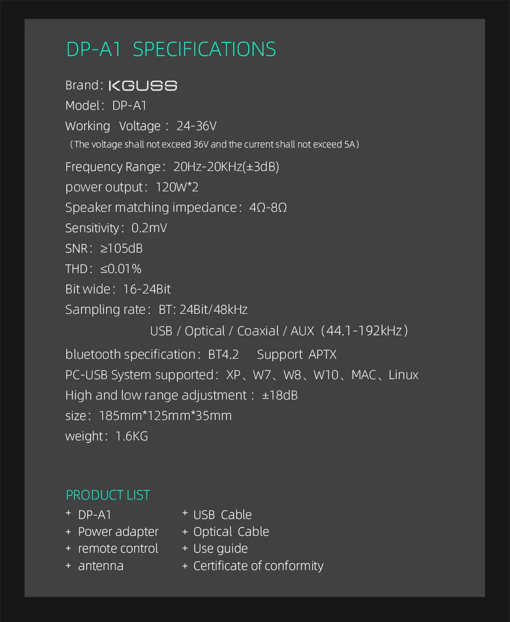 KGUSS DP-A1 Цифровой Bluetooth 4,2 CSR64215 усилитель