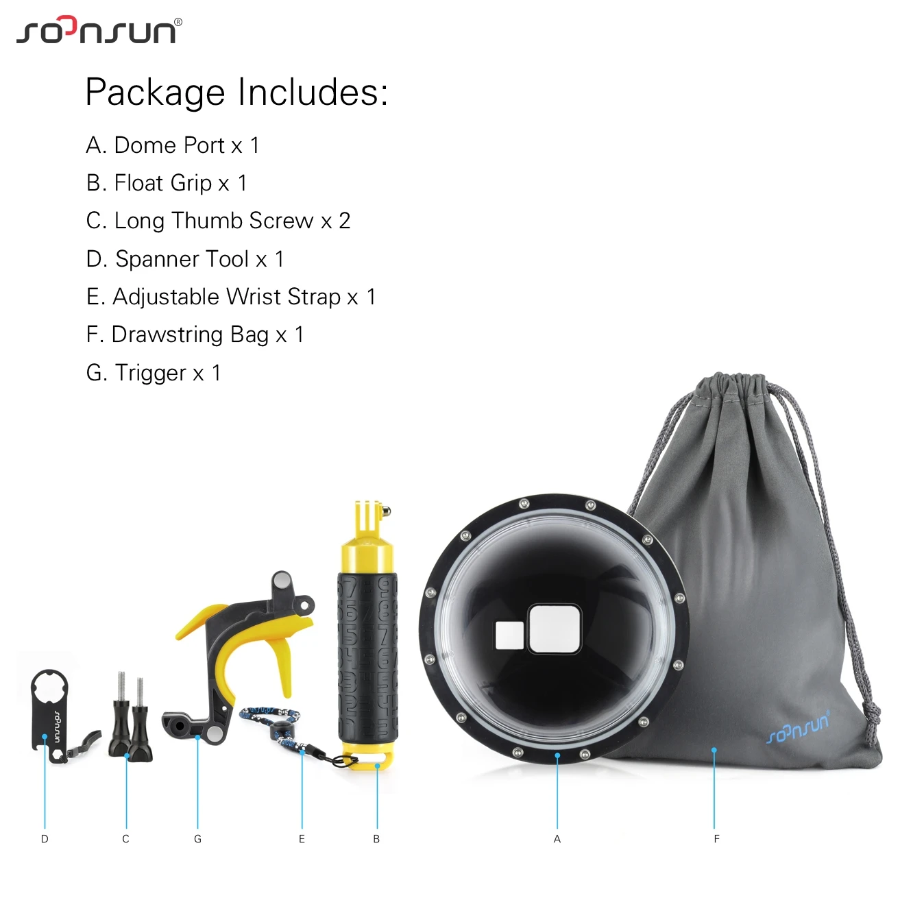 Купол порт x 1 Плавающая рукоятка x 1 Триггер x 1 Гаечный ключ x 1 Длинный Винт x 2 Ремешок-1 шт. Сумка-мешок-1 шт.