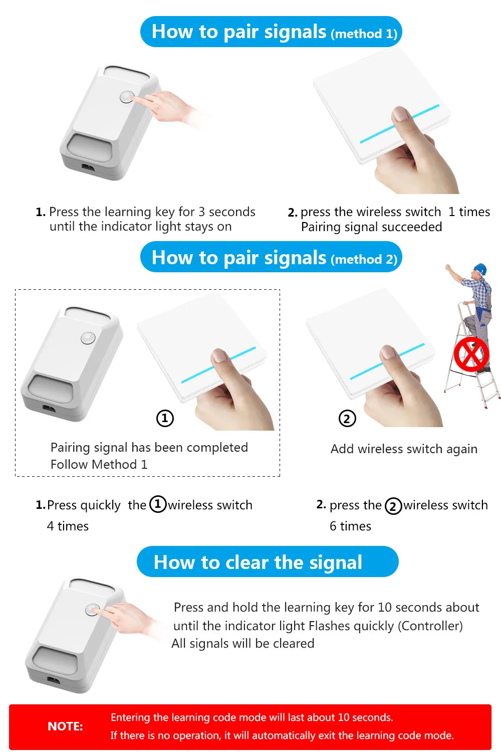 Метод 1: 1. Нажмите и удерживайте клавишу обучения в течение 3 секунд, пока светильник индикатора не включится (контроллер) 2. Нажмите беспроводной переключатель 1 раз 3. Индикатор светильник (контроллер) мигнет дважды 4. Сигнал сопряжения успешно Примечание: Вход в режим кода обучения продлится около 10 секунд. Если операция отсутствует, он автоматически покинет режим обучающего кода.
