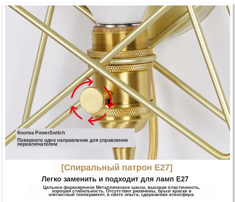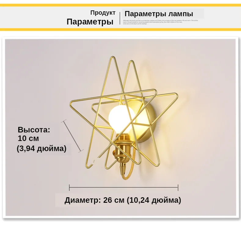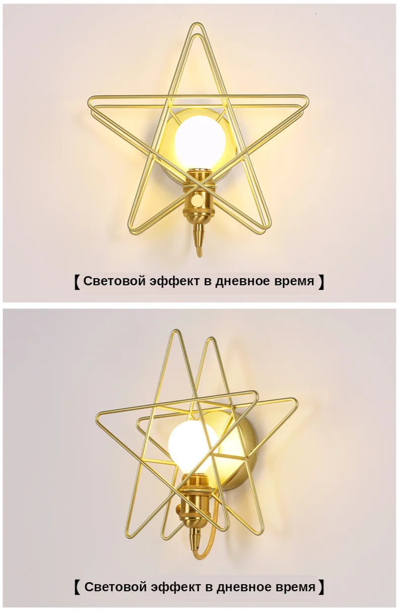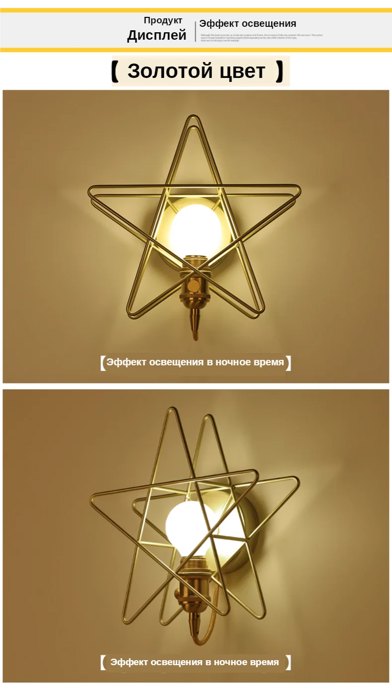 Модель: настенный светильник в форме звезды Размеры: Диаметр: 26 см (10,24 дюйма) Высота: 10 см (3,94 дюйма) Держатель лампы: E27 Контроллер переключателя: ручка переключателя Источник света: Теплый или холодный белый Светодиодный лампы (все указанные аккумуляторы входят в комплект поставки) Абажур Цвет: золотистый Абажур Материал: железо