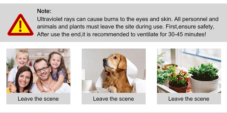 После использования, потому что лампа убивала много бактерий в комнате, пожалуйста, откройте окна и двери, позвольте комнате проветривать 15 минут, а затем войти.