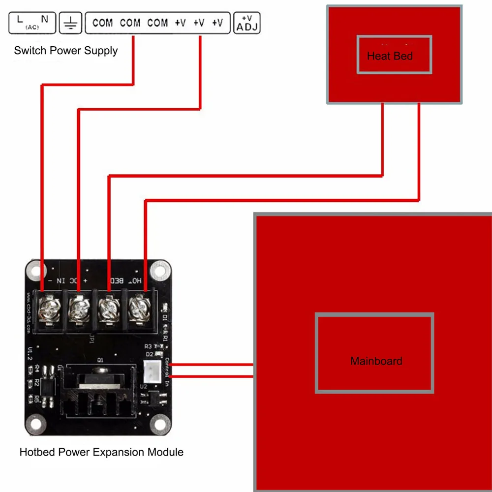 Поскольку плата контроллера ChiTu может работать только 15 А, эта настройка не будет работать. Чтобы он работал, вам нужен этот дополнительный модуль питания.