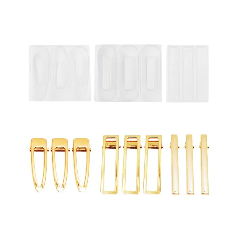 Description: Features: 100% brand new and high quality Perfect tools for your DIY craft projects make hair clips from resin. Made of high quality silicone, flexible and reusable, easy to use. Odorless, non-toxic, dust-proof, durable, non-permeable. Thick enough, well resistant to tearing, hard to deform, pretty durable. Specification: Color: White+Gold Material: Silicone, Metal Mold Size: app. 7.4x4.3cm(2.91x1.69in)/2 6.9x9cm(2.72x3.54in)/6.9x7.5cm(2.72x2.95in) Quantity: 1 set Note: Transition: 1cm=10mm=0.39inch No retail package. Please allow 1-3cm error due to manual measurement. pls make sure you do not mind before you bid. Due to the difference between different monitors, the picture may not reflect the actual color of the item. Thank you! Package includes: 3 pcs x Silicone Barrette Mold 9 pcs x Geometric Hair Clip (other accessories demo in the picture is not included.)