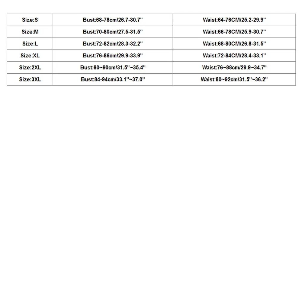 Размер Бюст Талия S 68-78 см/26,7-30,7" 64-76 см/25,2-29,9 дюйма М 70-80 см/27,5-31,5" 66-78 см/25,9-30,7" L 72-82 см/28,3-32,2" 68-80 см/26,8-31,5" XL 76-86 см/29,9-33,9" 72-84 см/28,4-33,1" 2XL 80 ~ 90 см/31,5 "~ 35,4" 76 ~ 88 см/29,9 ~ 34,7" 3XL 84-94 см/33,1 "~ 37,0" 80 ~ 92 см/31,5 "~ 36,2"