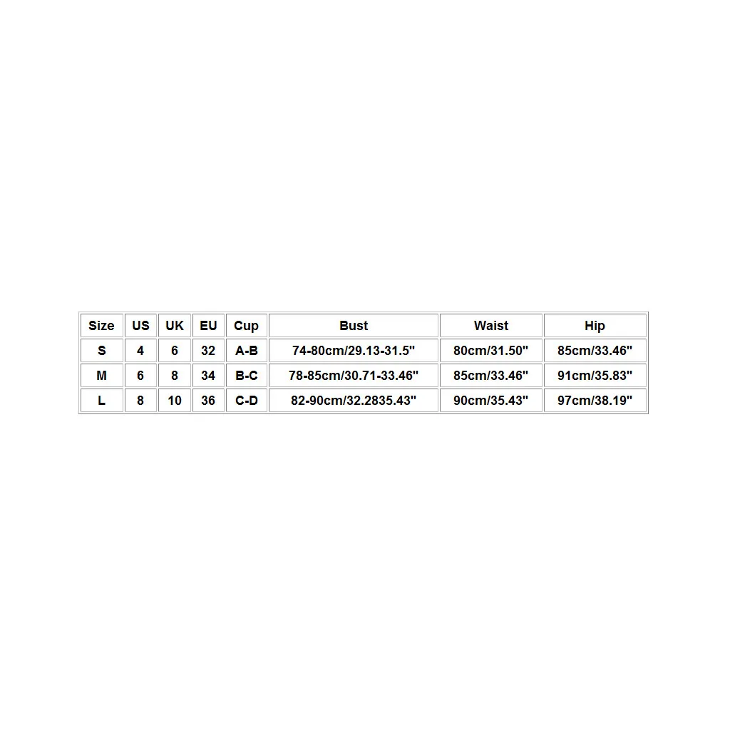 Размер США Великобритания ЕС Чашка Бюст Талия Бедра S 4 6 32 A-B 74-80 см/29,13-31,5'' 80 см/31,50'' 85 см/33,46'' М 6 8 34 B-C 78-85 см/30,71-33,46'' 85 см/33,46'' 91 см/35,83'' L 8 10 36 C-D 82-90 см/32283543'' 90 см/35,43'' 97 см/38,19''