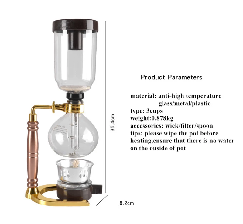 Материал: высокотемпературное стекло/металл/пластик Наименование: Кофеварка Тип: 3 чашки/5 чашек Аксессуары: фитиль/фильтр/Ложка Советы: Перед нагревом протрите кастрюлю, убедитесь, что на внешней стороне кастрюли находится вода