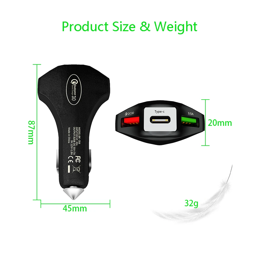 Особенности 【 1 】 3-USB Зарядка: QC3.0 + 3.5A + 1Type-C позволяет одновременно заряжать 3 устройства 【 2 】 безопасность: Встроенный молоток безопасности для непредвиденных потребностей 【 3 】 Быстрая зарядка: Qualcomm 3,0 Быстрая зарядка как оригинальное зарядное устройство 【 4 】 огнеупорный ПК: обеспечить безопасность с огнеупорным материалом 【 5. USB-C выход: поддержка зарядки USB-C устройств, таких как телефоны Type-C, планшеты, ноутбуки, Macbook и т. Д. 【 6 】 дизайн Hammerfall: дизайн Hammerfall делает его таким крутым 【 7 】 Высокоскоростная зарядка: сильный максимальный 35 Вт 7а большой ток для быстрой зарядки 3 устройств 【 8 Универсальная совместимость: подходит для большинства транспортных средств и устройств с напряжением 12-24 В 【 9 】 мульти-Защита: Полностью защищает ваши устройства от интеллектуального автомобильного зарядного устройства 【 10 】 матовый материал: сделать автомобильное зарядное устройство не царапается, чтобы сохранить в новом