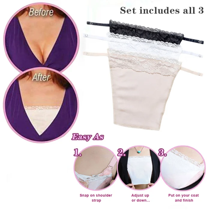 1. Просто прикрепите Этот невидимый бюстгальтер к лямке бюстгальтера, чтобы создать вид кружевного жилета, не будучи громоздким, сдвиньте его вверх и вниз, чтобы контролировать необходимое покрытие, И Используйте его для регулировки декольте топов и платьев с низким вырезом.