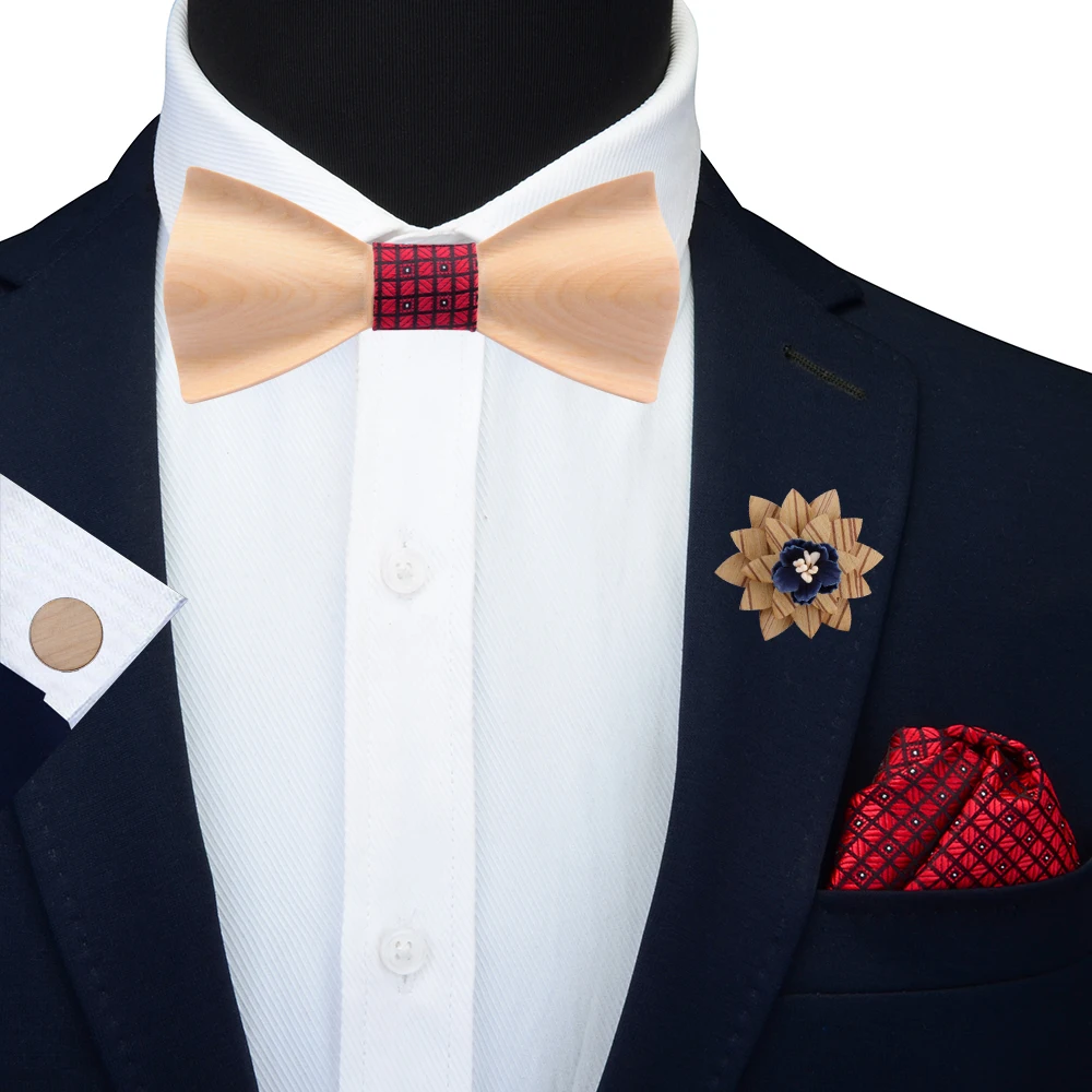 Галстук-бабочка Размеры: 12 см * 5,5 см Платок Размеры: 22 см * 22 см Включает: деревянная бабочка, Hanky, запонки и брошь Посылка: деревянная подарочная коробка У Factroy: Да Оптовая продажа со скидкой: Да Изготовленный на заказ ярлык: Да Легко сочетать Вечерние