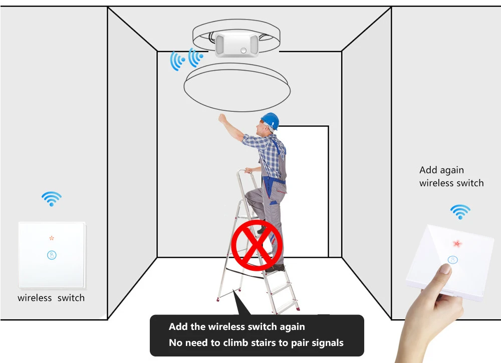 Метод 2: Нет необходимости поднимать по ступенькам для сопряжения сигналов 1. Сенсорный быстро (1) беспроводной переключатель 4 раза 2. Сенсорный (2) беспроводной переключатель 6 раз 3. Сигнал сопряжения успешно Примечание: 1. Обязательное условие: перед началом работы этого шага должен быть сигнал сопряжения между пультом дистанционного управления и контроллером