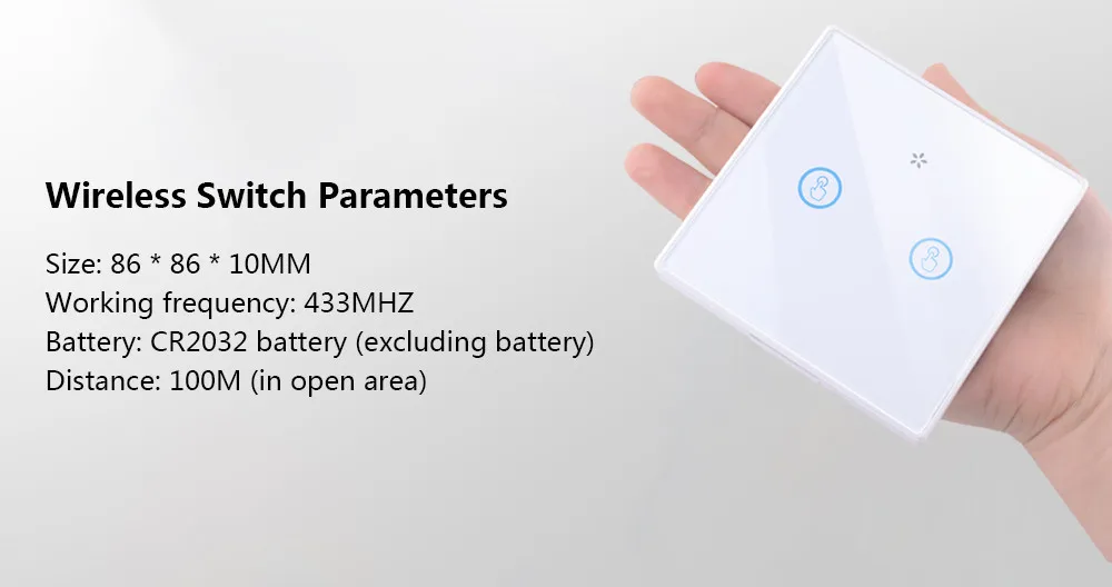 Размер: 86*86*10 мм Рабочая частота: 433 МГц Батарея: батарея CR2032 (без аккумулятора) Расстояние: 100 м (в открытой местности)