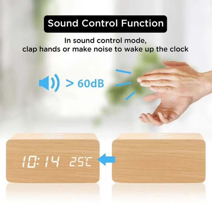 Современный деревянный цифровой светодиодный Настольный будильник термометр Qi Беспроводное зарядное устройство для дома и офиса JS23