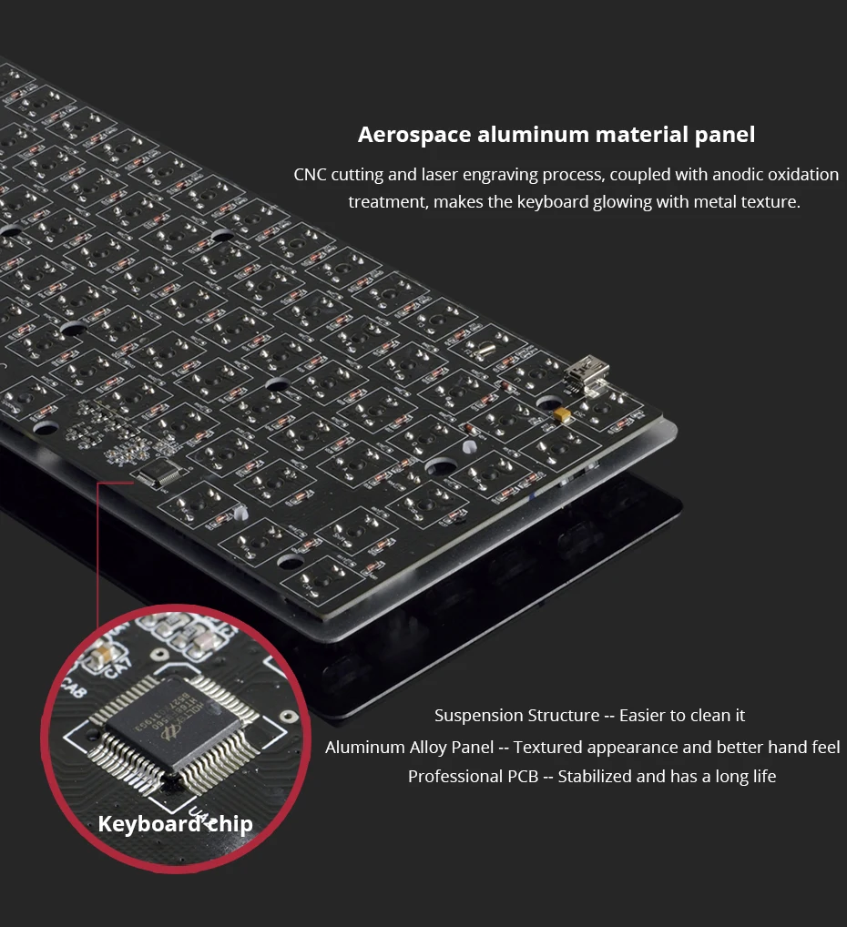 Процесс резки с ЧПУ и лазерной гравировки в сочетании с обработкой анодного окисления делает клавиатуру светящейся с металлической текстурой. Подвесная конструкция-легче чистить панель из алюминового сплава-текстурированный внешний вид и лучшая ручная работа, Профессиональная печатная плата -- Стабильный и имеет долгий срок службы.
