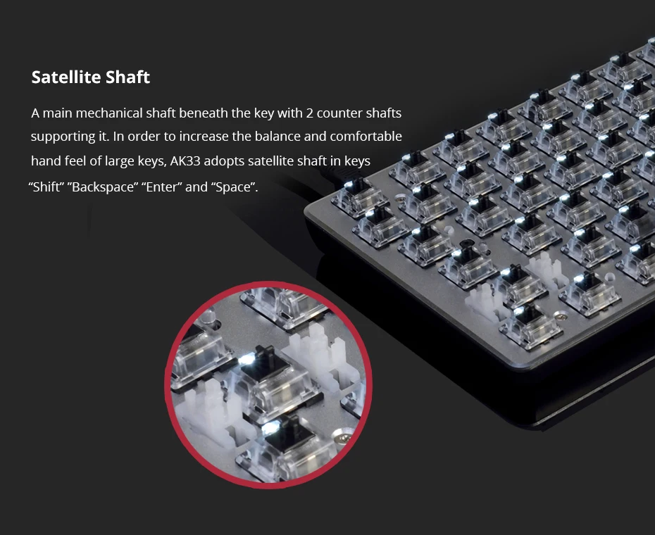 Главный механический вал beneththe key с 2 стоечными валами, поддерживающими его. Для увеличения баланса и комфортного ощущения от больших клавиш AK33 использует спутниковый вал в клавишах «Shift» «Backspace» «Eneter» и «Space»
