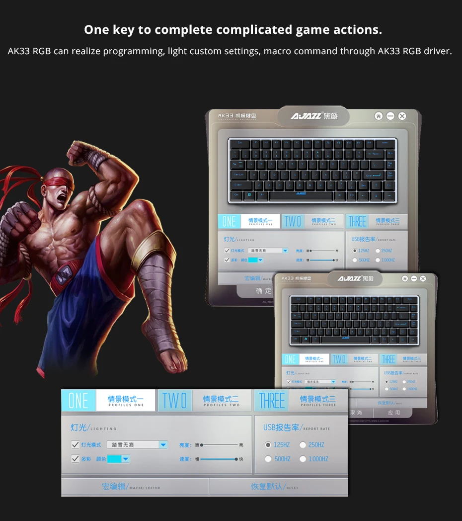 AK33 RGB может реализовывать программирование, легкие Пользовательские настройки, макрокоманды через драйвер AK33 RGB.