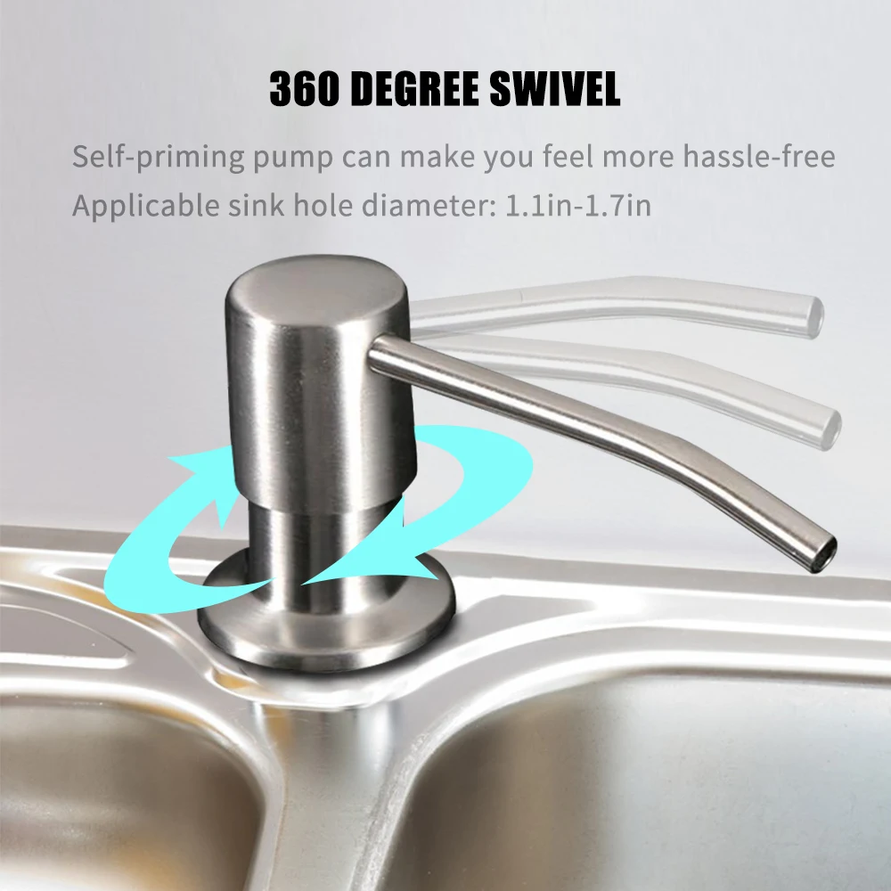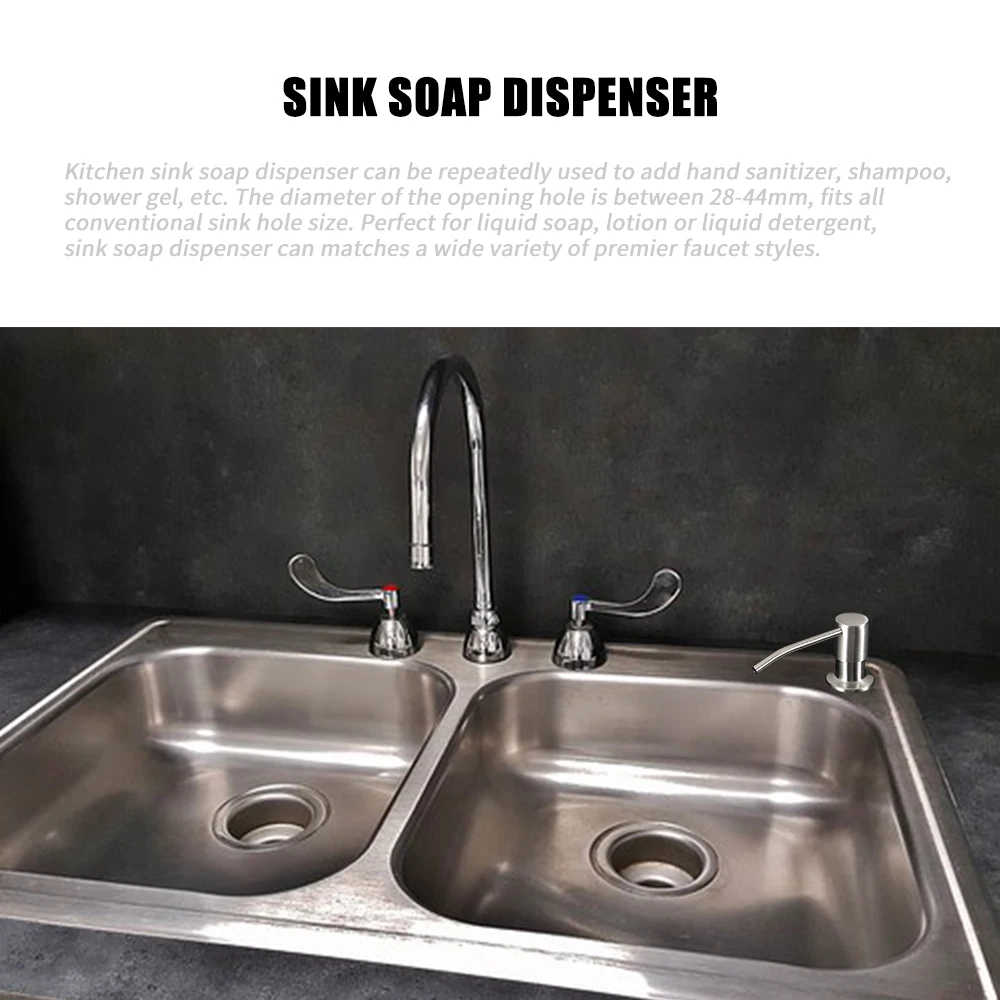 Диспенсер для мыла для кухонной раковины можно повторно использовать для добавления дезинфицирующего средства для рук, шампуня, геля для душа и т. д. диаметр отверстия составляет 28-44 мм, подходит для всех обычных размеров раковины. Идеально подходит для жидкого мыла, лосьона или жидкого моющего средства, диспенсер для мойки мыла может сочетаться с широким разнообразием основных стилей смесителя.