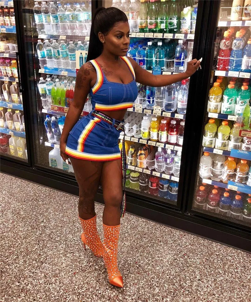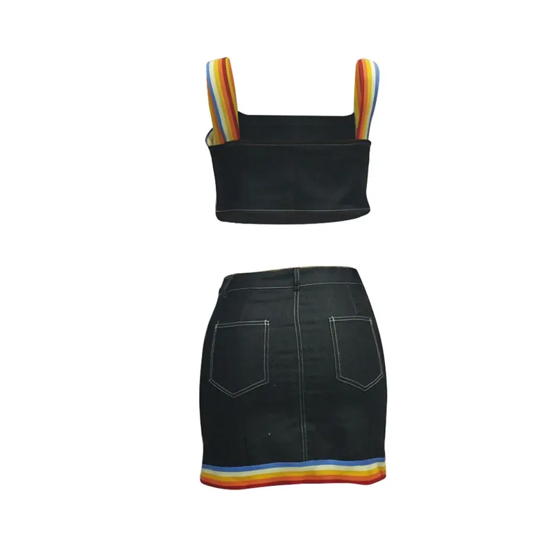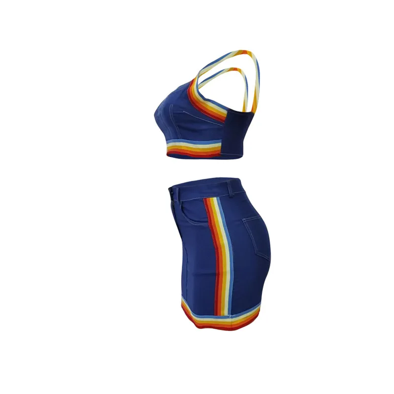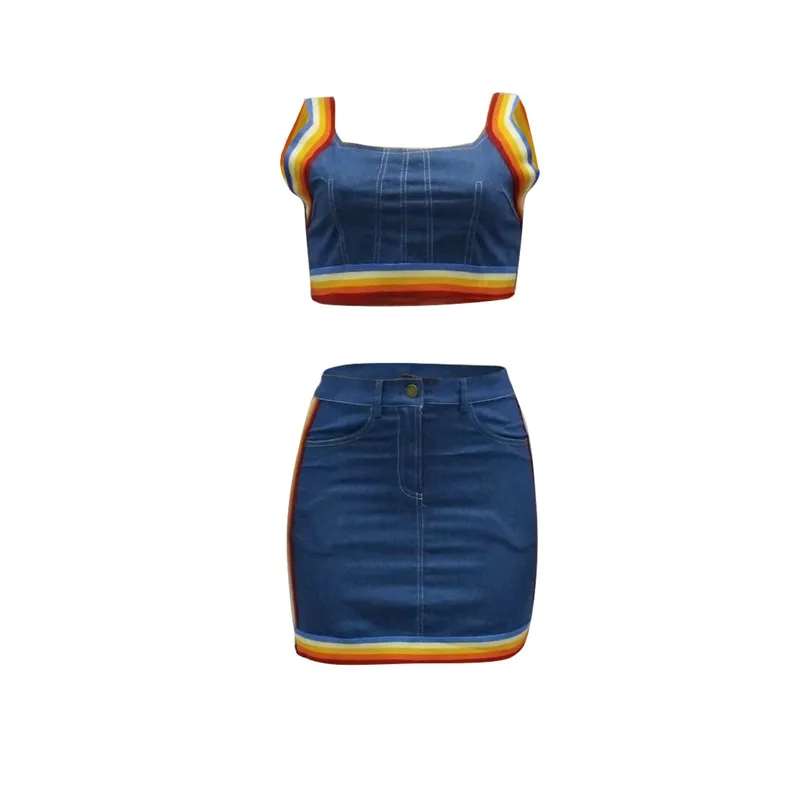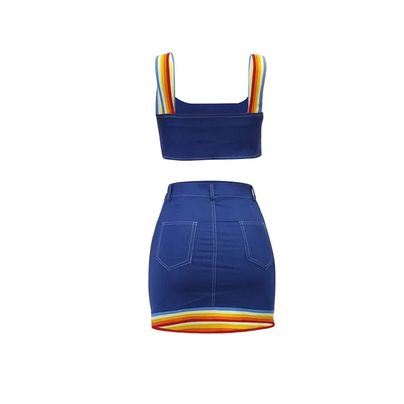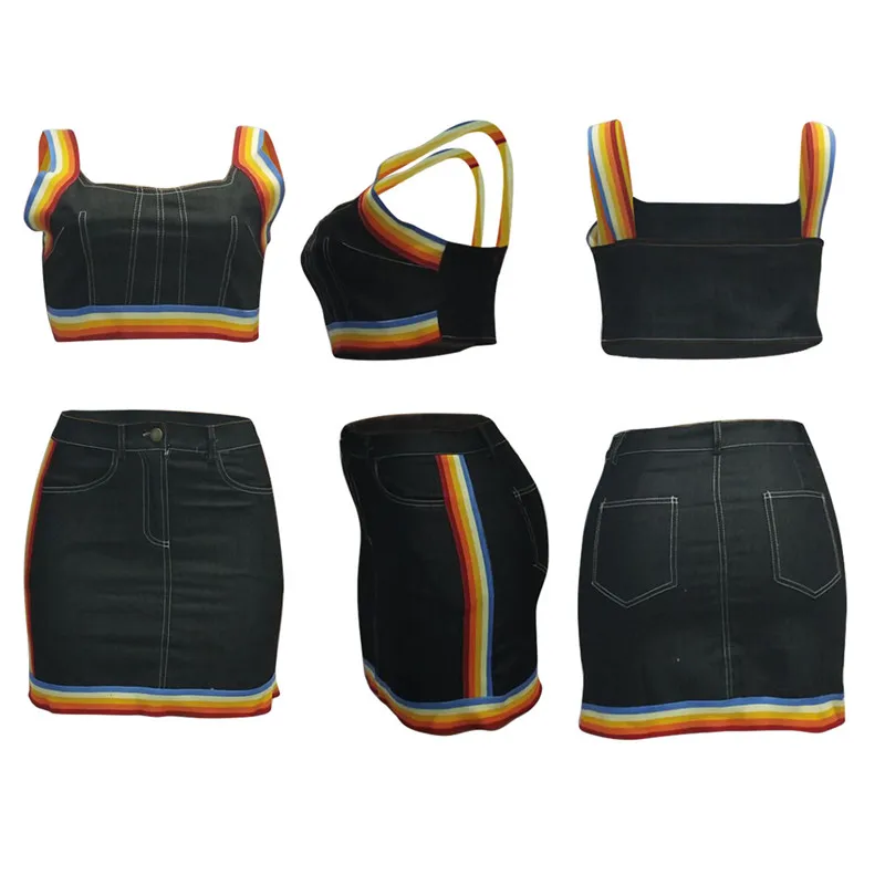 Сексуальный женский костюм из двух предметов, костюм из джинсовой ткани, майка в радужную полоску, бюстье, корсеты, укороченный топ с высокой талией, мини-юбка-карандаш, платье, новинка