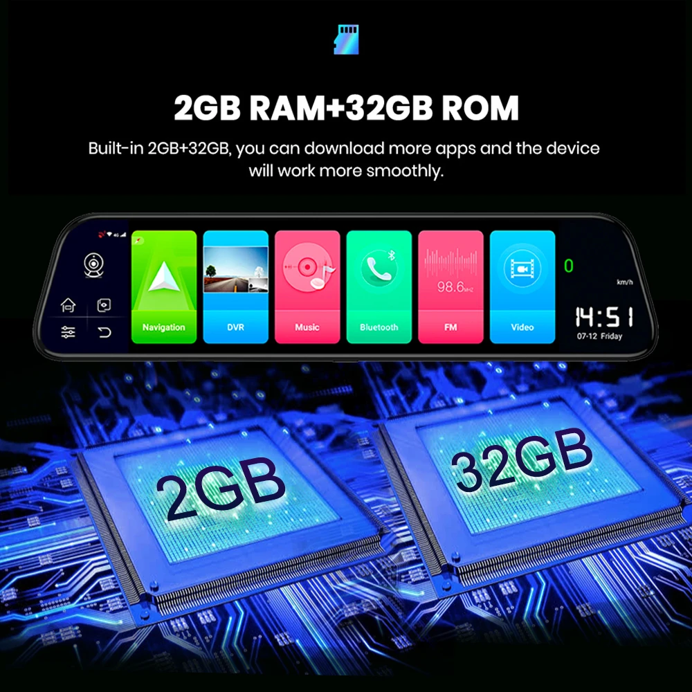 Android 8,1 (последняя система) + 2 Гб RAM/32 Гб ROM (достаточная память для установки приложений и нормальной работы) + ADAS Plus (LDWS/FCWS/FVMA) + gps-навигация + Запись Full HD 1080 P + 4G SIM и WIFI + Bluetooth + полный экран удаленного монитора в приложении для владельца автомобиля + 12