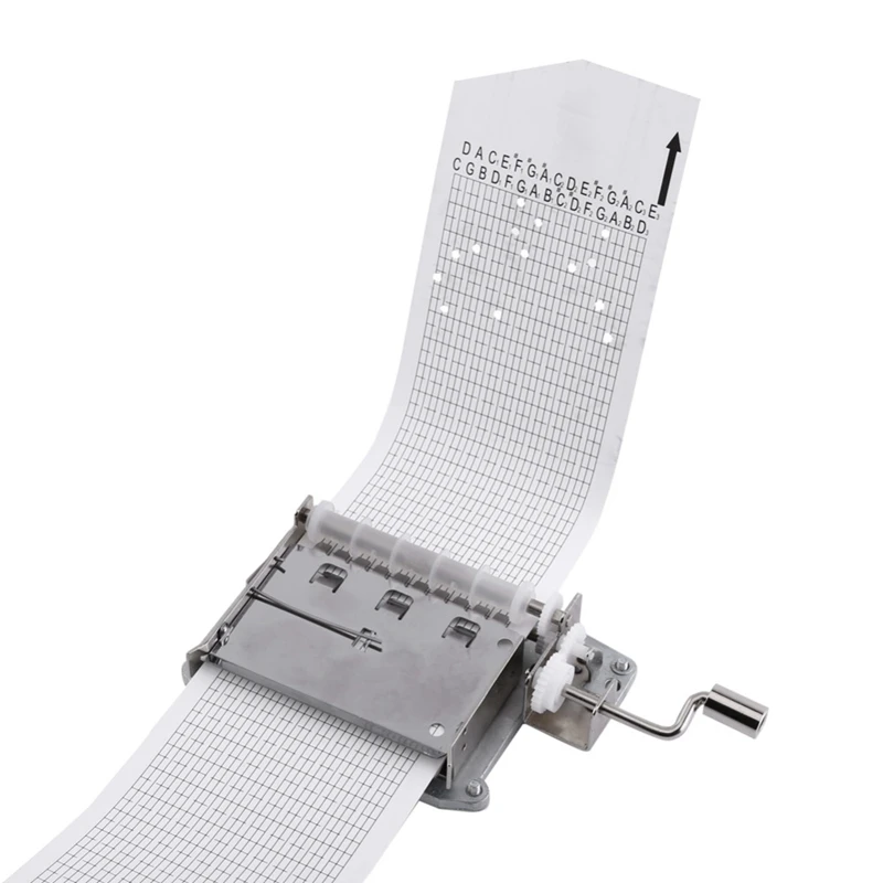 Механизм музыкального ящика включает металлический перфоратор и 3 ленты для практики и имитации. Создайте свою собственную музыкальную мелодию, пробивая отверстия в предоставленных бумажных полосках и играйте в любую песню, которую вы хотите. Пустые ленты используются для создания музыки, и вы также можете сделать новые ленты с толстой бумагой.