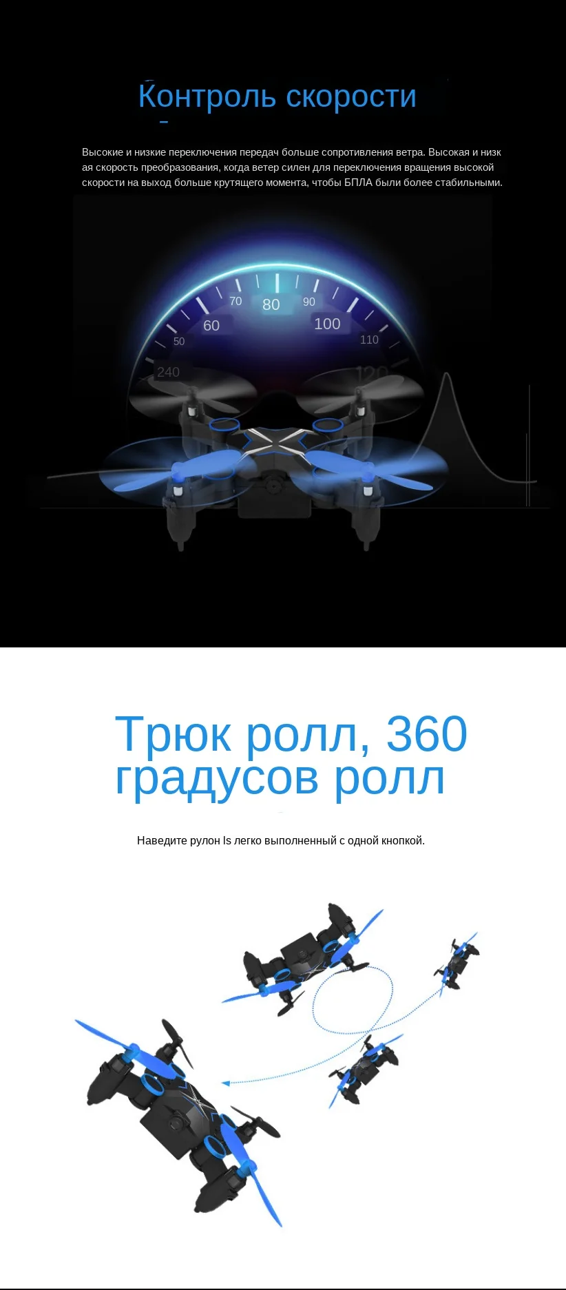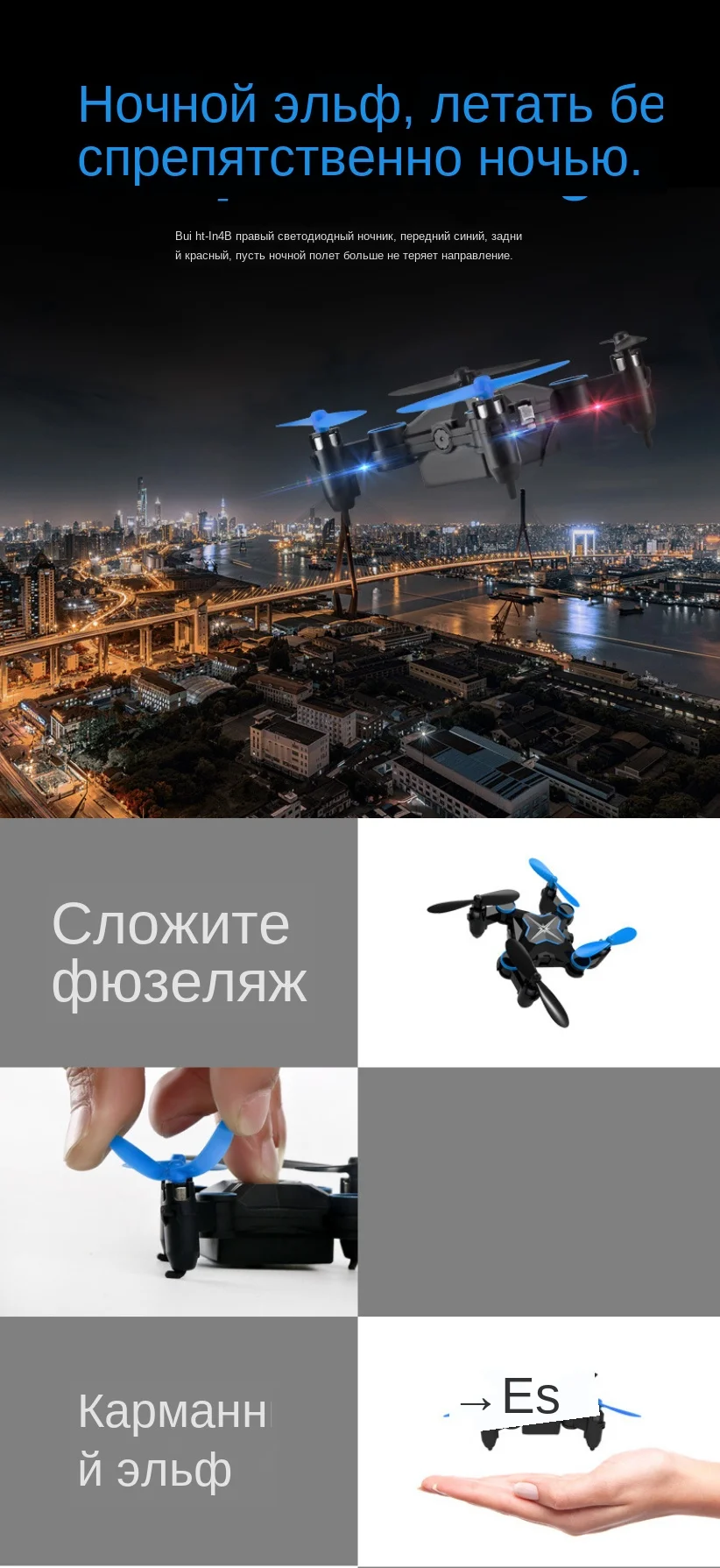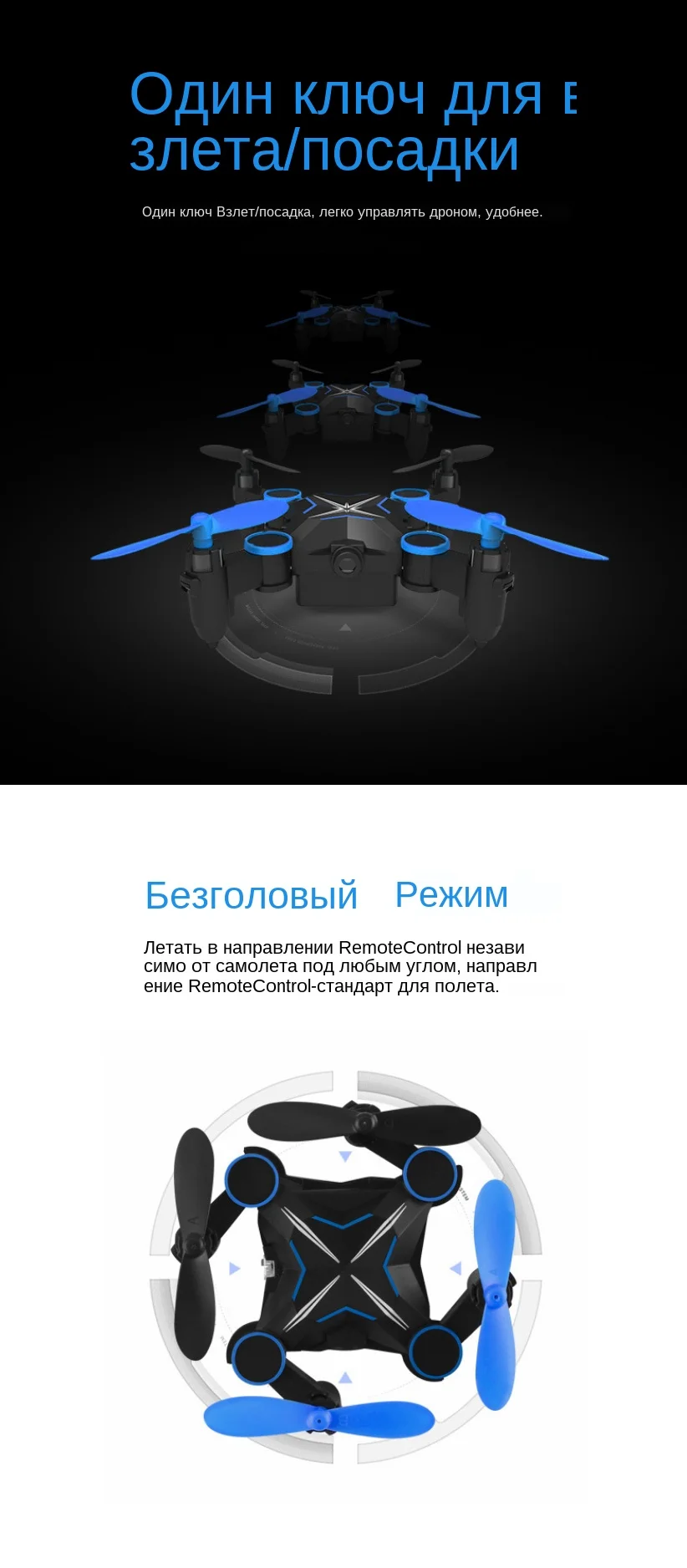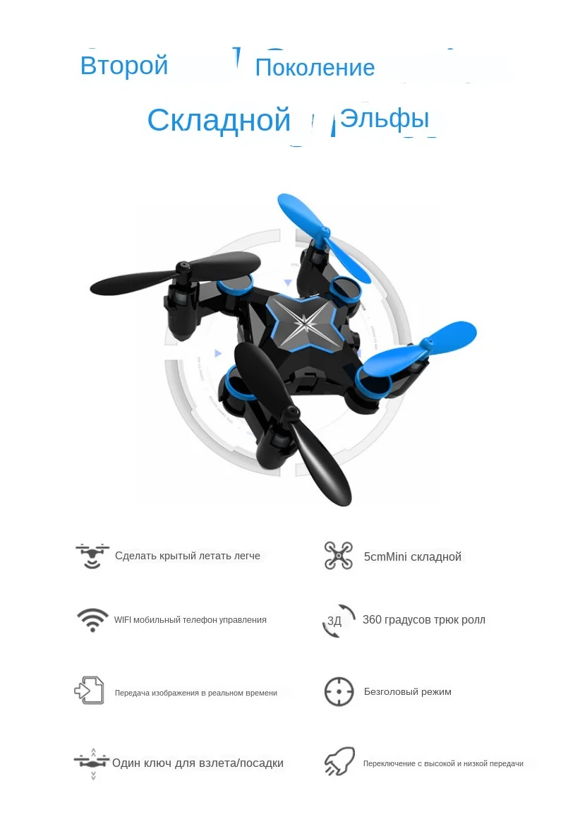 -Интегрированный, легко носить с собой Небольшой, но чрезвычайных -Pocket ELF, легко носить с собой Складной вниз фюзеляжа составляет всего 5 см -Давление воздуха фиксируется высоко, может точно зафиксировать высоту и положение, стабильный парение. Легко записывает каждый момент вашей жизни -Управление через приложение, без пульта ДУ Мобильный телефон подключен к летательного аппарата WI-FI и летательного аппарата управляется с помощью мобильного телефона. Wifi-это чистая передача сигнала, сеть не используется, и мобильный телефон не занят. -Отображение отснятого материала в реальном времени Подключите самолет Wifi, вы можете достичь полного контроля полета и фотосъемки, передача изображения четкая, записывая прекрасные моменты жизни. -Один ключ для взлета/посадки Один ключ Взлет/посадка, легко управлять БПЛА, более удобно. -Безголовый режим, Летающий в направлении пульта ДУ Независимо от самолета под любым углом, направление дистанционного управления является стандартом для полета. -Контроль скорости, высокая и низкая переключение передач больше сопротивления ветра. Высокая и низкая 2 скорости преобразования, когда ветер сильный, чтобы переключить высокоскоростное вращение на выход больше крутящего момента, так что Uav является более стабильным. -Трюковый рулон, легкий рулон на 360 градусов Рулон ховера легко выполнен с помощью одной кнопки. -Сигнал 2,4 ГГц, без помех Технология расширения спектра 2,4 ГГц, дистанция дистанционного управления радиусом 120 м, скорость отклика, сильная способность защиты от помех, поддержка нескольких дронов, играющих одновременно без помех. -Возврат одной кнопкой, легко с помощью одной кнопки вспомнить Дрон Встроенная система позиционирования, в безголовом режиме, когда БПЛА летит на большое расстояние, не может определить направление, может легко отозвать БПЛА через ключ возврата. -Ночной эльф, летающий без помех ночью. Встроенный 4 яркий светодиодный ночник, передний синий, сзади, с помощью красных, пусть ночных полетов больше не потерял направление.