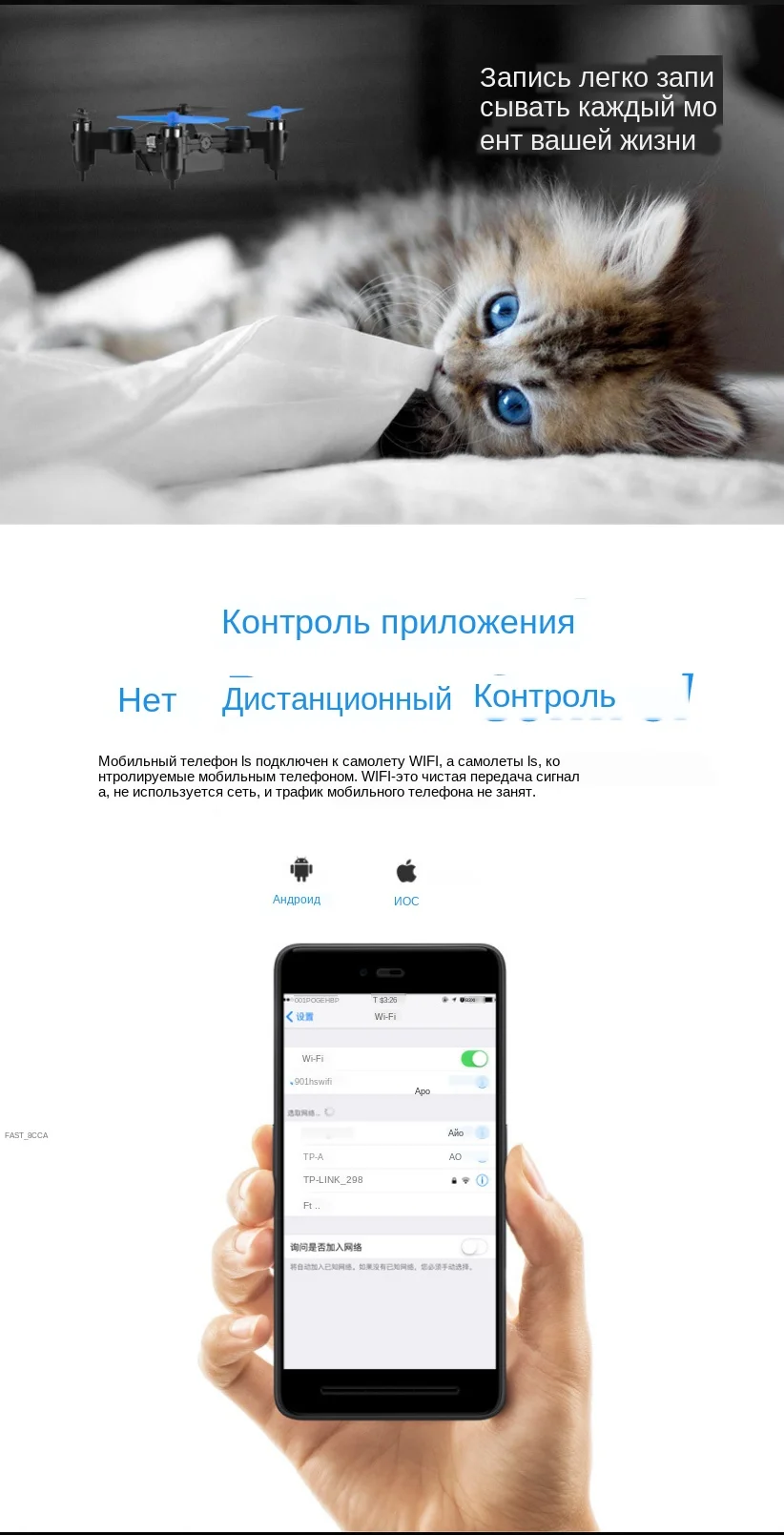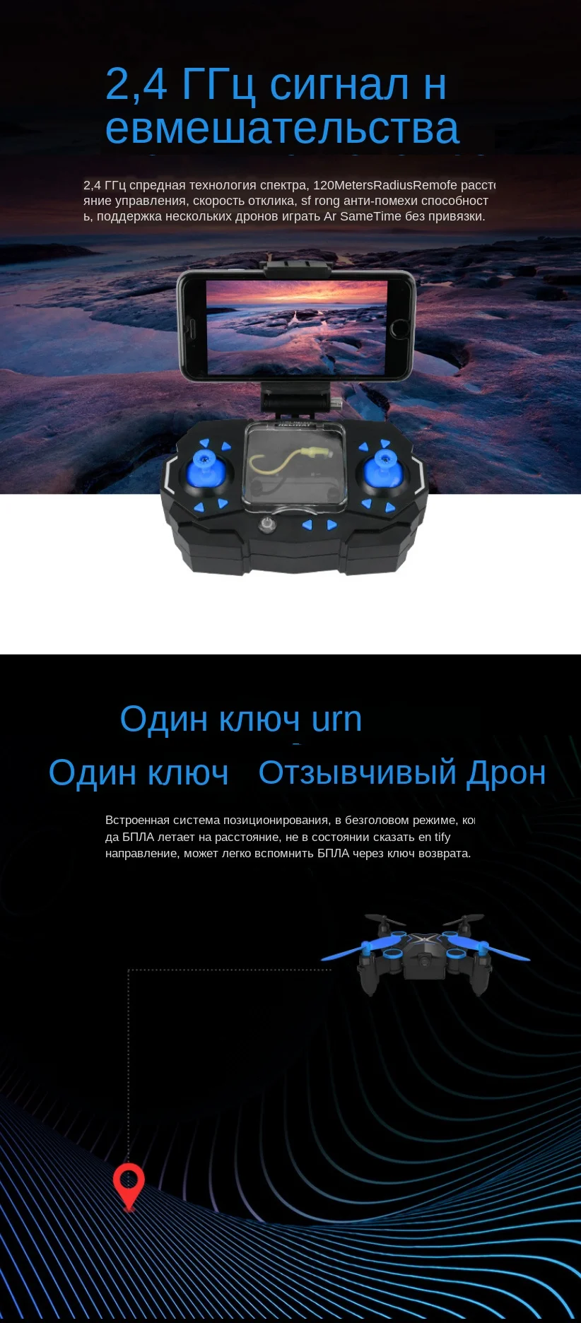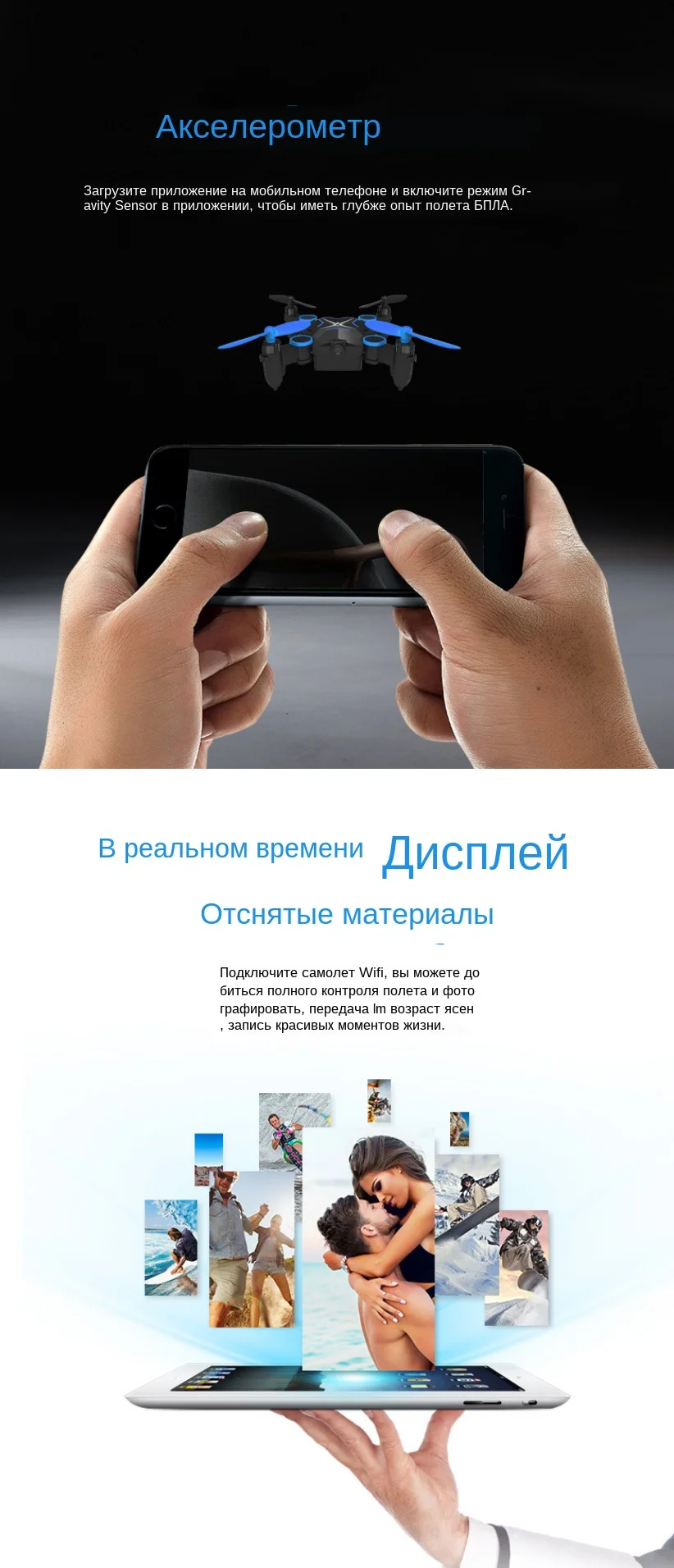 -Интегрированный, легко носить с собой Небольшой, но чрезвычайных -Pocket ELF, легко носить с собой Складной вниз фюзеляжа составляет всего 5 см -Давление воздуха фиксируется высоко, может точно зафиксировать высоту и положение, стабильный парение. Легко записывает каждый момент вашей жизни -Управление через приложение, без пульта ДУ Мобильный телефон подключен к летательного аппарата WI-FI и летательного аппарата управляется с помощью мобильного телефона. Wifi-это чистая передача сигнала, сеть не используется, и мобильный телефон не занят. -Отображение отснятого материала в реальном времени Подключите самолет Wifi, вы можете достичь полного контроля полета и фотосъемки, передача изображения четкая, записывая прекрасные моменты жизни. -Один ключ для взлета/посадки Один ключ Взлет/посадка, легко управлять БПЛА, более удобно. -Безголовый режим, Летающий в направлении пульта ДУ Независимо от самолета под любым углом, направление дистанционного управления является стандартом для полета. -Контроль скорости, высокая и низкая переключение передач больше сопротивления ветра. Высокая и низкая 2 скорости преобразования, когда ветер сильный, чтобы переключить высокоскоростное вращение на выход больше крутящего момента, так что Uav является более стабильным. -Трюковый рулон, легкий рулон на 360 градусов Рулон ховера легко выполнен с помощью одной кнопки. -Сигнал 2,4 ГГц, без помех Технология расширения спектра 2,4 ГГц, дистанция дистанционного управления радиусом 120 м, скорость отклика, сильная способность защиты от помех, поддержка нескольких дронов, играющих одновременно без помех. -Возврат одной кнопкой, легко с помощью одной кнопки вспомнить Дрон Встроенная система позиционирования, в безголовом режиме, когда БПЛА летит на большое расстояние, не может определить направление, может легко отозвать БПЛА через ключ возврата. -Ночной эльф, летающий без помех ночью. Встроенный 4 яркий светодиодный ночник, передний синий, сзади, с помощью красных, пусть ночных полетов больше не потерял направление.