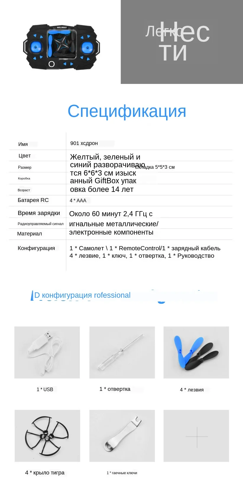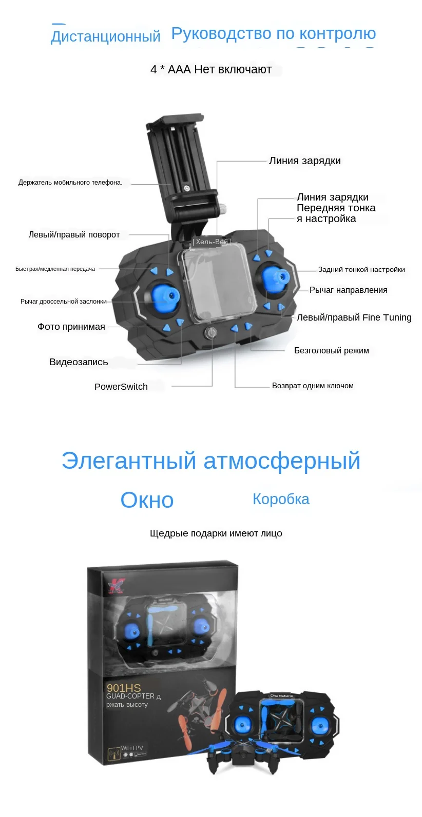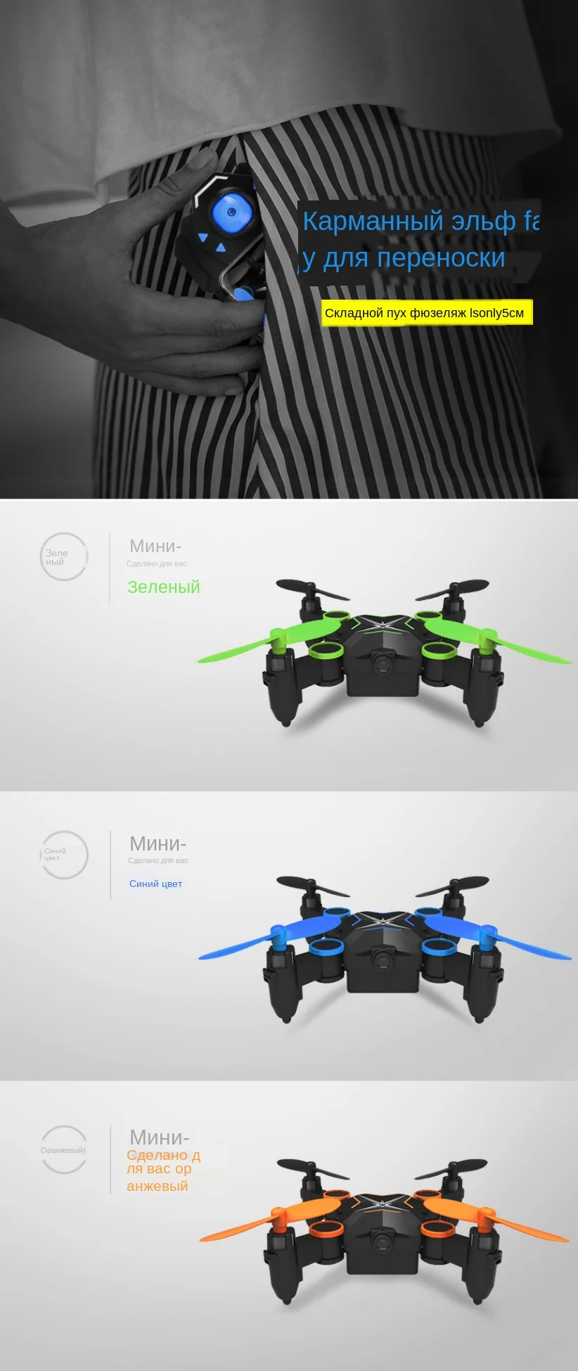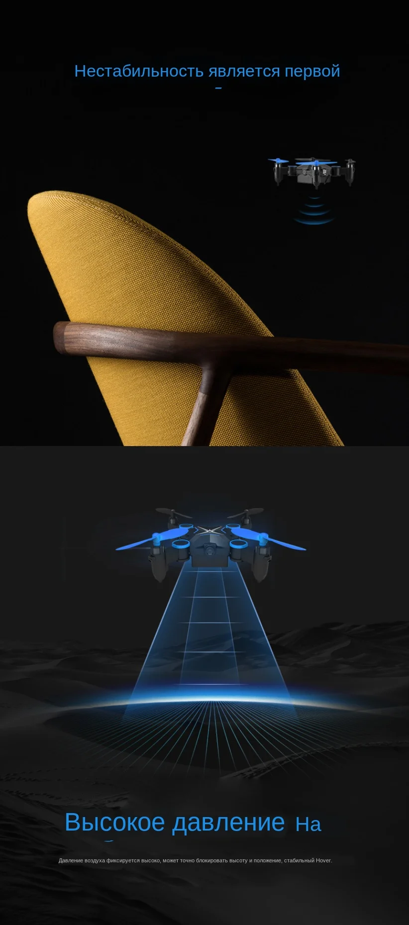 -Интегрированный, легко носить с собой Небольшой, но чрезвычайных -Pocket ELF, легко носить с собой Складной вниз фюзеляжа составляет всего 5 см -Давление воздуха фиксируется высоко, может точно зафиксировать высоту и положение, стабильный парение. Легко записывает каждый момент вашей жизни -Управление через приложение, без пульта ДУ Мобильный телефон подключен к летательного аппарата WI-FI и летательного аппарата управляется с помощью мобильного телефона. Wifi-это чистая передача сигнала, сеть не используется, и мобильный телефон не занят. -Отображение отснятого материала в реальном времени Подключите самолет Wifi, вы можете достичь полного контроля полета и фотосъемки, передача изображения четкая, записывая прекрасные моменты жизни. -Один ключ для взлета/посадки Один ключ Взлет/посадка, легко управлять БПЛА, более удобно. -Безголовый режим, Летающий в направлении пульта ДУ Независимо от самолета под любым углом, направление дистанционного управления является стандартом для полета. -Контроль скорости, высокая и низкая переключение передач больше сопротивления ветра. Высокая и низкая 2 скорости преобразования, когда ветер сильный, чтобы переключить высокоскоростное вращение на выход больше крутящего момента, так что Uav является более стабильным. -Трюковый рулон, легкий рулон на 360 градусов Рулон ховера легко выполнен с помощью одной кнопки. -Сигнал 2,4 ГГц, без помех Технология расширения спектра 2,4 ГГц, дистанция дистанционного управления радиусом 120 м, скорость отклика, сильная способность защиты от помех, поддержка нескольких дронов, играющих одновременно без помех. -Возврат одной кнопкой, легко с помощью одной кнопки вспомнить Дрон Встроенная система позиционирования, в безголовом режиме, когда БПЛА летит на большое расстояние, не может определить направление, может легко отозвать БПЛА через ключ возврата. -Ночной эльф, летающий без помех ночью. Встроенный 4 яркий светодиодный ночник, передний синий, сзади, с помощью красных, пусть ночных полетов больше не потерял направление.