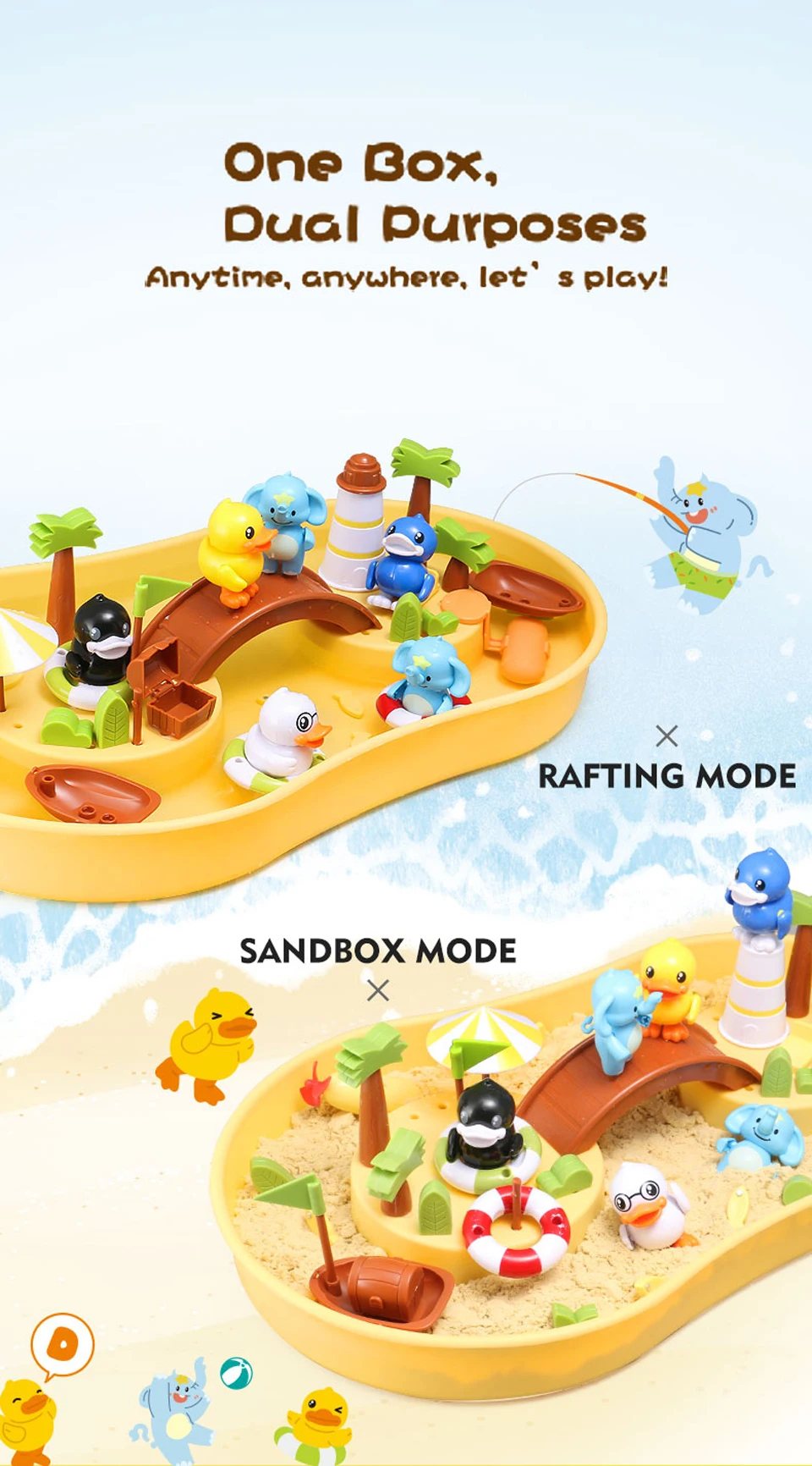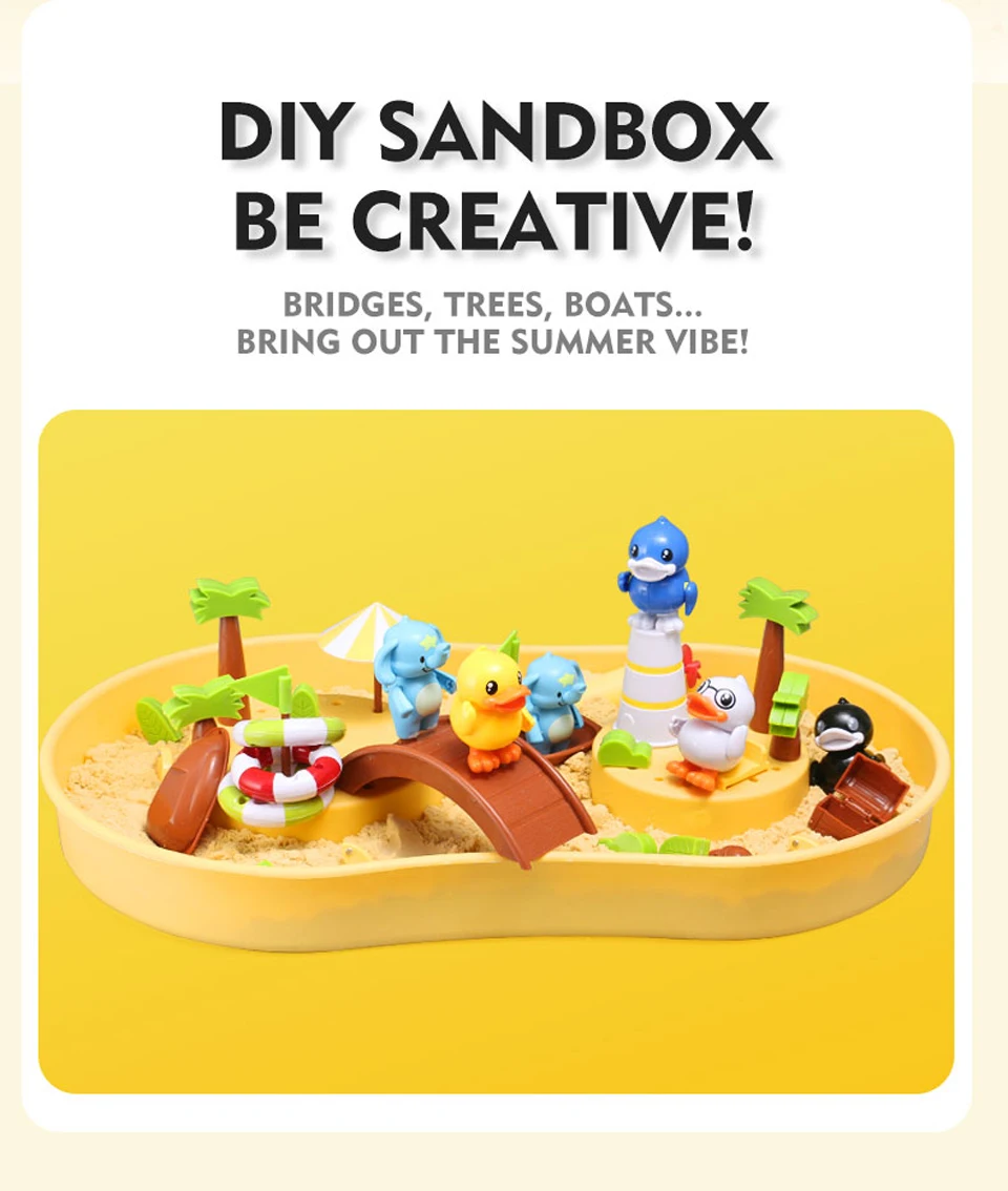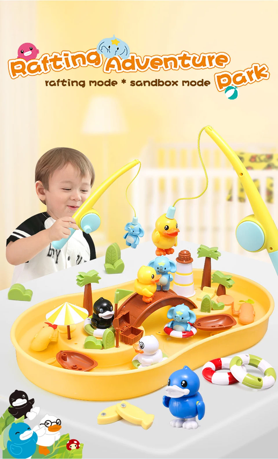 1 коробка (залейте воду или песок) 1 удочка (с магнитом) 4 фигурки (с магнитами сверху) и плавательные кольца 8 маленьких рыб (с магнитами) 2 плавающие пчелы (с магнитами) 1 подводная лодка (требуется 1 батарейка ААА) 1 Песок строительный пресс-форм Несколько украшения 1 Руководство пользователя