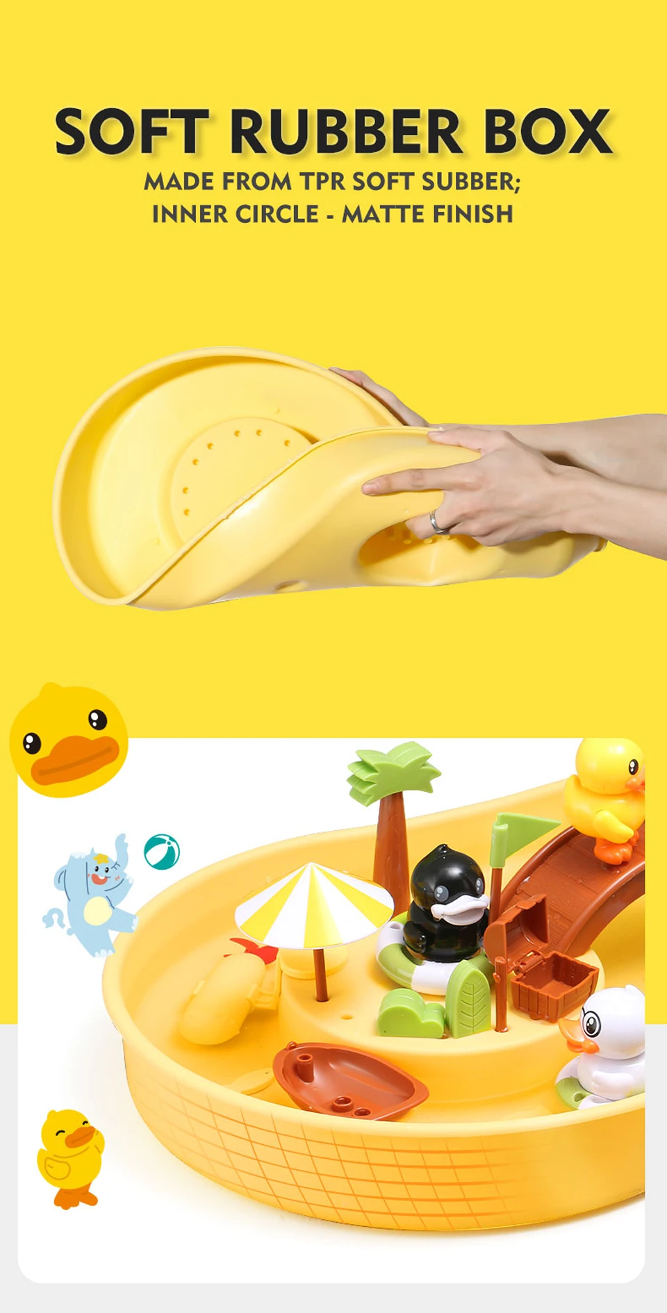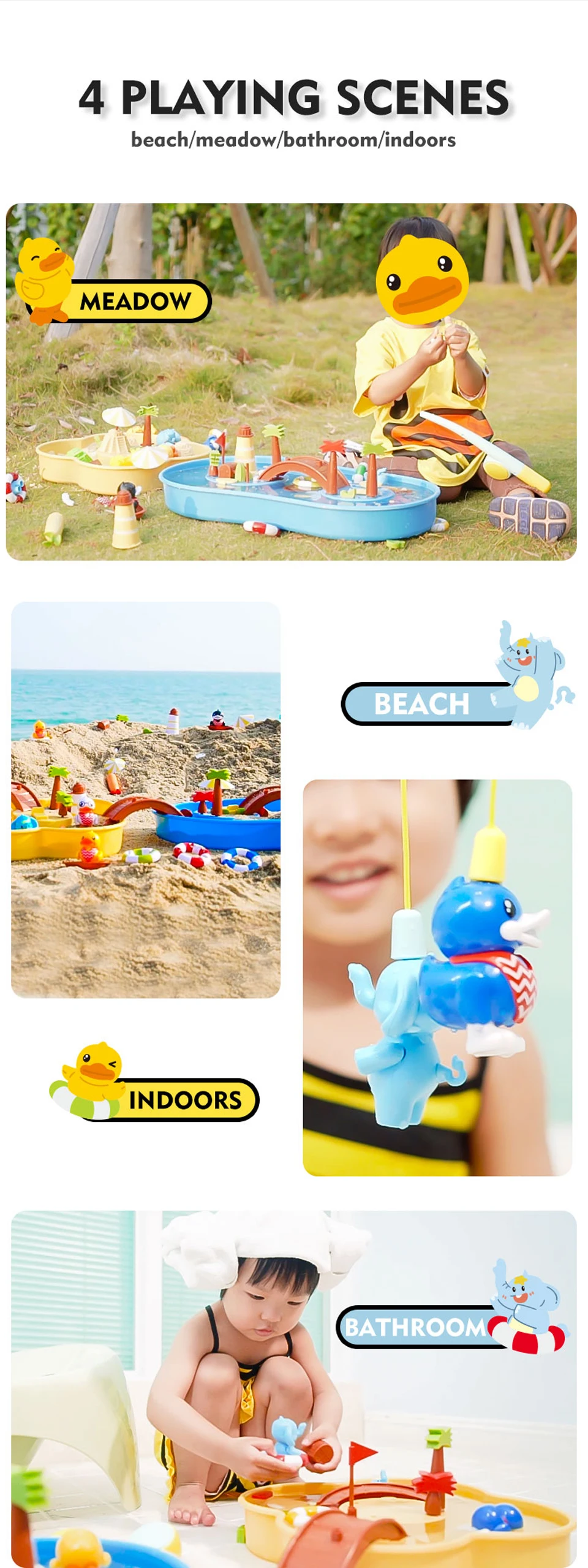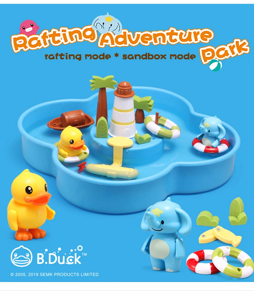1 коробка (залейте воду или песок) 1 удочка (с магнитом) 4 фигурки (с магнитами сверху) и плавательные кольца 8 маленьких рыб (с магнитами) 2 плавающие пчелы (с магнитами) 1 подводная лодка (требуется 1 батарейка ААА) 1 Песок строительный пресс-форм Несколько украшения 1 Руководство пользователя