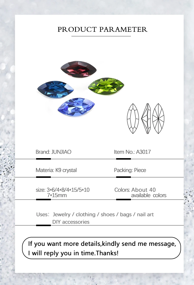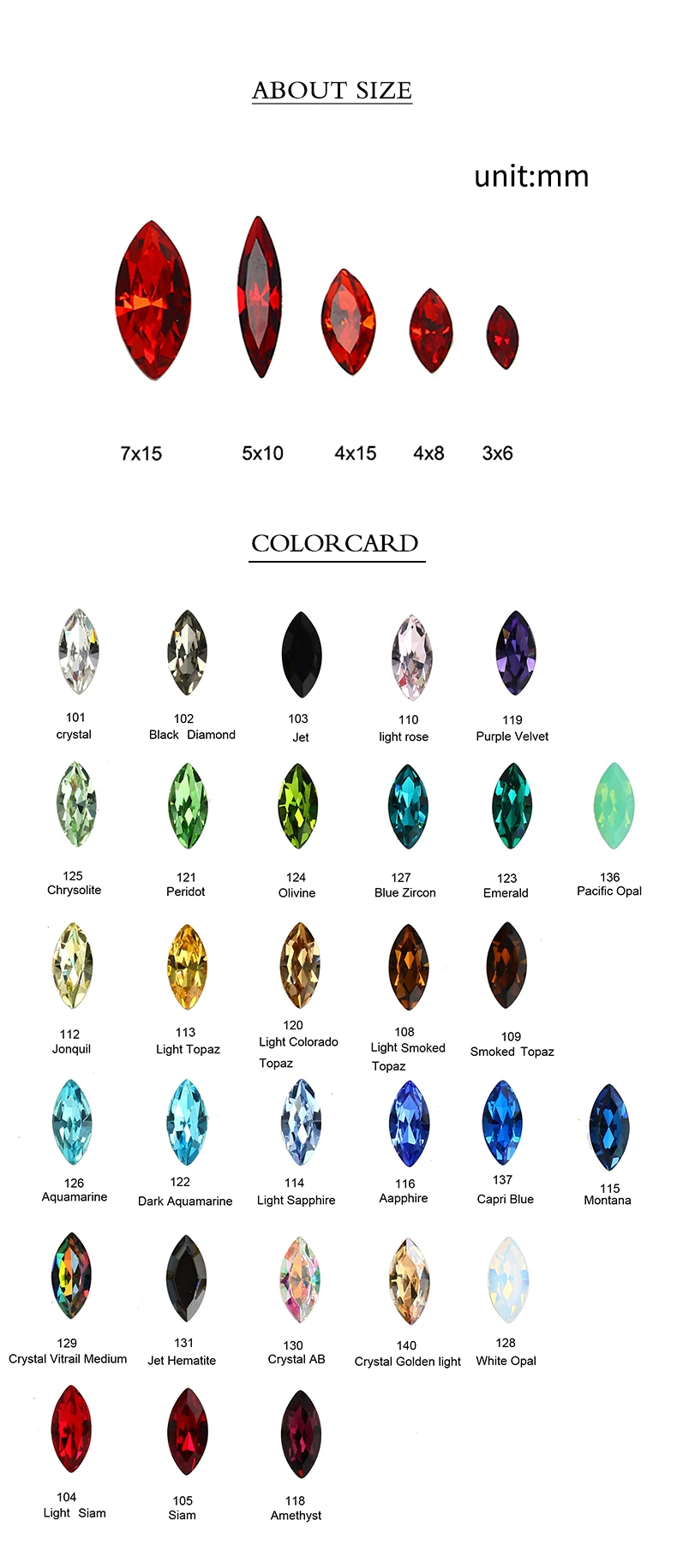 Размер и форма: 3*6/4*8/4*15/5*10/7*15 мм и конский глаз
