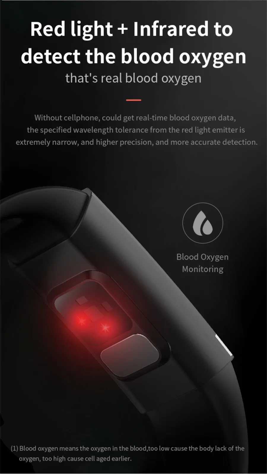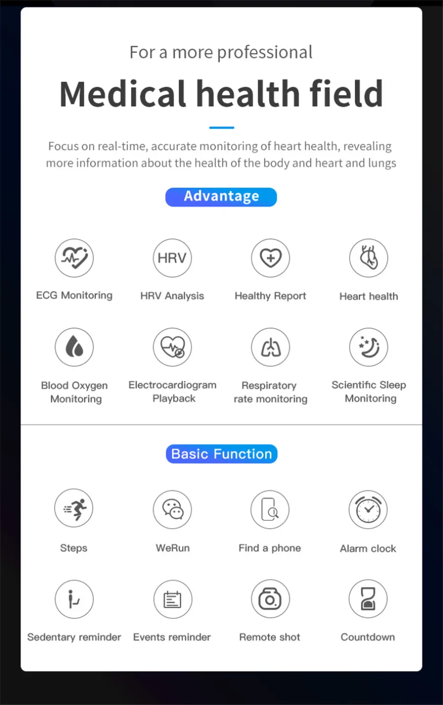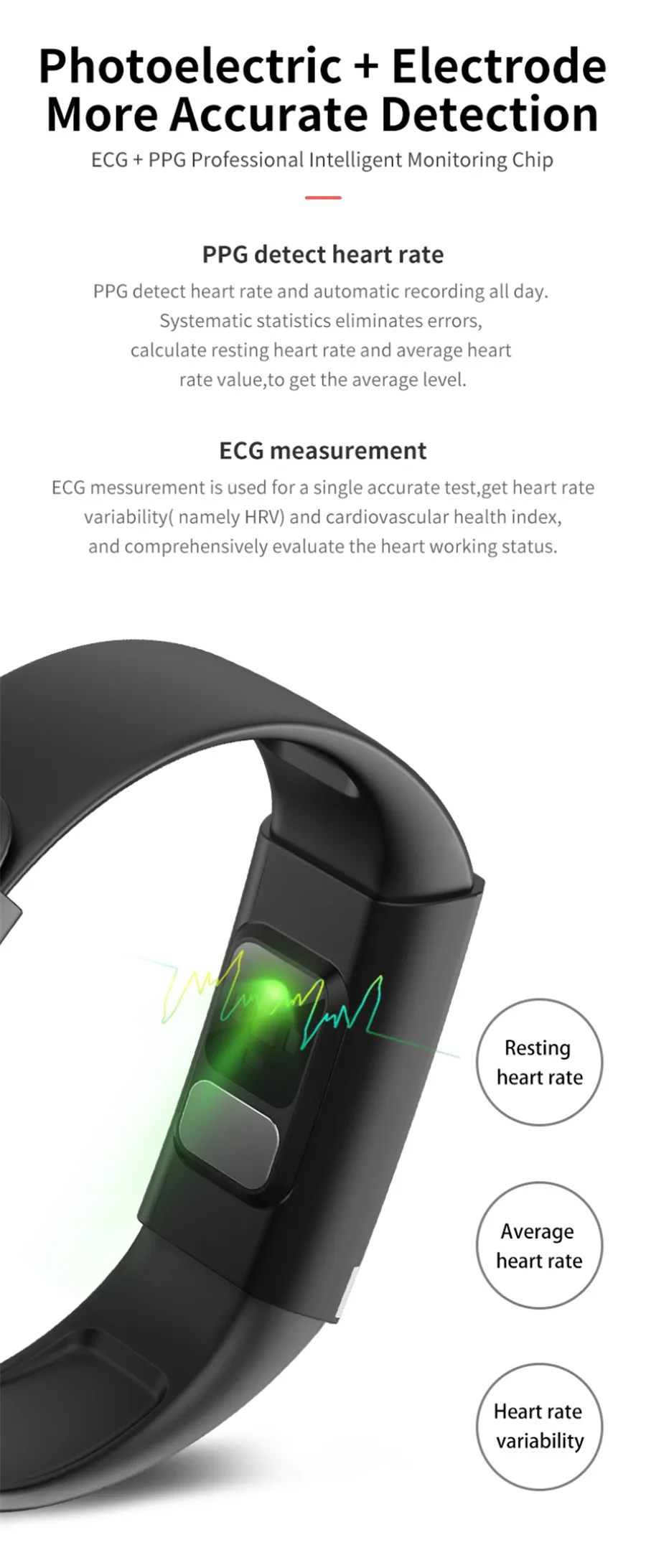 2 ECG medição, monitoramento e análise da VFC, 24-hora de teste de frequência cardíaca durante todo o dia, teste de pressão arterial, monitoramento de oxigênio no sangue, o monitoramento do sono (o tempo de sono, a qualidade do sono), sedentário lembrete, lembrete de Chamada, empurrar a mensagem, levante a mão e a tela se ilumina, Permite que você digite a vida inteligente e viver uma vida saudável.