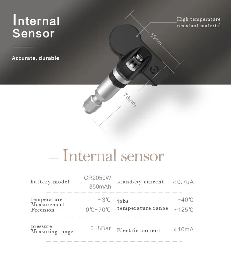 Основные функции: -Мощная система контроля давления в шинах: Он контролирует давление и температуру шин в режиме реального времени, что позволит передавать данные в реальном времени на DVD вашего автомобиля, чтобы напомнить водителю о комфорте и безопасности вождения автомобиля. -Широкое применение: Эта система широко подходит для автомобиля с четырьмя шинами и максимальным давлением в шинах ниже 8 бар, таких как Коммерческое транспортное средство, Джип, внедорожник, автобус, И седан и т. Д. -Цифровой ЖК-дисплей: Включает в себя приемник TPMS, четыре внешних датчика и u-диск. Данные о шинах в режиме реального времени будут отправлены на DVD через usb-порт, чтобы вы могли легко и удобно узнать статус вашего автомобиля с DVD. -4 внешних датчика: Обеспечивает четыре датчика, которые подходят для использования в любую погоду. Кроме того, они обладают высокой чувствительностью и хорошей точностью для измерения давления и температуры. Характеристики: Внешний датчик: -Аккумулятор: встроенный элемент кнопки CR2025 -Рабочее напряжение: 2,1-3,5 V -Рабочая температура: минус 30-плюс 60 градусов. C -Диапазон измерения температуры: минус 30-плюс 85 градусов. От -Диапазон измерения давления: 0-116 psi Частота передачи: 433,92 МГц Приемник системы контроля давления в шинах: -Рабочее напряжение: 5 В постоянного тока -Рабочий ток: менее 15 мА -Рабочая частота: 433,92 МГц -Рабочая температура: минус 40-плюс 85 градусов. От -Длина usb-кабеля приемника: около 220 мм -Обратите внимание, что наш usb-приемник давления в шинах подходит только для радиосистемы Android