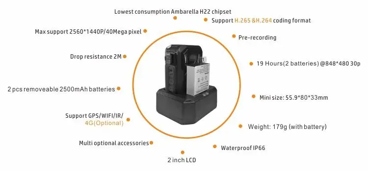 Фоточувствительная линза 4 МП CMOS HD объектив ov4689 Чип Anba H22M Самый высокий пиксель (5 м/8 м/10 м/12 м/16 м/21 м/32 м/40 м) Разрешение видео 2560*1440 30p (опционально) 2304*1296 30p (опционально) 1920x1080 30p 1280x720 30p 848x480 30p Формат видео H.264 H.265/MPEG4 Быстрая вперед скорость 2X, 4X, 8X, 16X, 32X, 64X Скорость Перемотки 2X, 4X, 8X, 16X, 32X, 64X Аудио высокое качество Встроенный микрофон Формат аудио WAV Идентификация устройства водяного знака, идентификация полицейского, время и дата Поддержка непрерывной съемки для скоростной непрерывной съемки Формат фото JPEG Поддержка снимков для съемки фотографий в видеозахвате Разрешение видео 848*480 30P/15P (live) 1280*720 30P/15P (live) Объем памяти 32G/64G Оставшийся экран памяти с звуковым сигналом Видео светодиодный Запись в одно касание поддерживает запись в одно нажатие Функция предварительной записи ≥ 10 с Задержка записи ≥ 5s расширенная запись Качество видео супер хорошее/отличное/нормальное Инфракрасный выключатель автоматический/ручной Включение/выключение голосовой передачи Время деления 3 минут/5 минут/10 минут/15 минут/30 минут/45 минут Активация напоминания визуальный/слуховой/тактильный мульти-директивное подтверждение записи Запуск и остановка 4G поддерживает электронный забор, кластерный Интерком, один клик сигнал, воспроизведение трека, предварительный просмотр в реальном времени, воспроизведение видео, поддержка обычного домофона Максимальное разрешение 4G для потоковой передачи видео в режиме реального времени 128X720 30P Инфракрасный выключатель автоматический/ручной Обнаружение движения ВКЛ/ВЫКЛ Аудиогид GPS / Beidou позиционирование опционально Беспроводное подключение 4G/WIFI/GPS Язык китайский/английский/другие (100 + заказы могут быть настроены) Экранная заставка 30 секунд/1 минута/3 минуты/5 минут Автоматическое выключение 30 секунд/1 минута/3 минуты/5 минут Кнопка поддержки тона Файловый Тип управления дорожным движением/Безопасность/уголовные дела/управление городским транспортом Скользящая опора ЖК-дисплей 2,0-дюймовый TFT-ЖК-дисплей цветной экран с высоким разрешением Обзор аудио и видео Видеовыход Передача видео USB2.0 Камера Поле обзора широкий угол 140 ° Функция съемки ночного видения Поддержка встроенных четырех высокоинтенсивных инфракрасных систем освещения, чтобы увидеть лицо на расстоянии 7 метров Водонепроницаемая функциональная поддержка, IP56 Высокое качество 360 ° вращающийся металлический зажим PTT поддерживает сетевой кластер Интерком Аккумулятор Встроенный литиевый аккумулятор 2500 мАч (двойной блок) Время зарядки 240 минут Время непрерывного использования 2*6 часов Оставшаяся мощность видео-дисплей и оповещение Номер с двумя часовыми поясами, с водяным знаком горлышко в форме 7-значный устройства с идентификатором, 6-значный цифровой полицейский ID, даты и времени Защита паролем файл может быть удален только после того, как пользователь вводит пароль. Пользователи могут просматривать файлы только при использовании инструмента правоохранительных органов, функция удаления отсутствует Другие Настраиваемая идентификация, отслеживание лица, поддержка H.265 передачи видео в реальном времени Вес около 175 г Рабочая температура-20 ~ 70 °C Температура хранения-40 ~ 80 °C Поддержка модуля (опционально) Размеры 80x57.4x32.5 мм