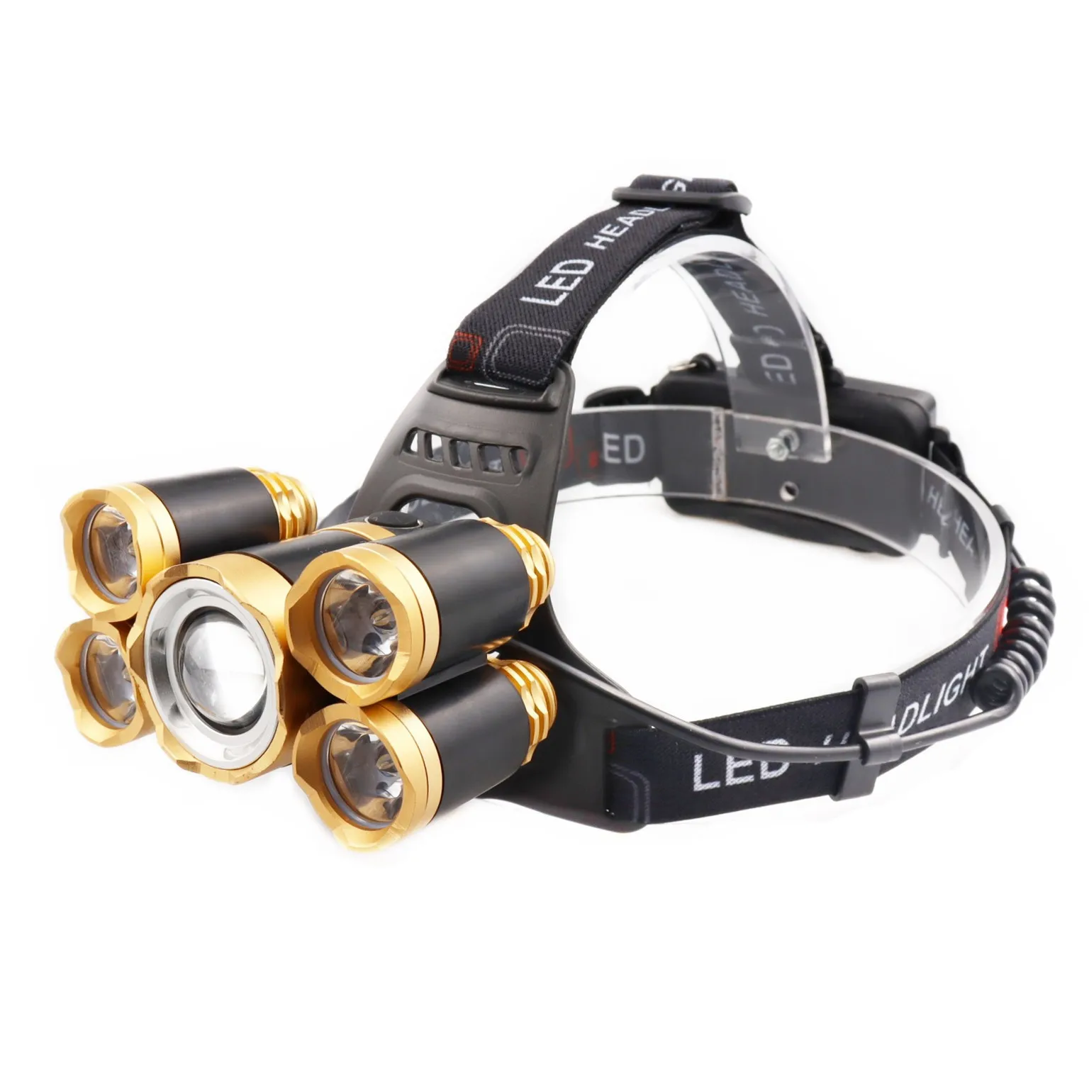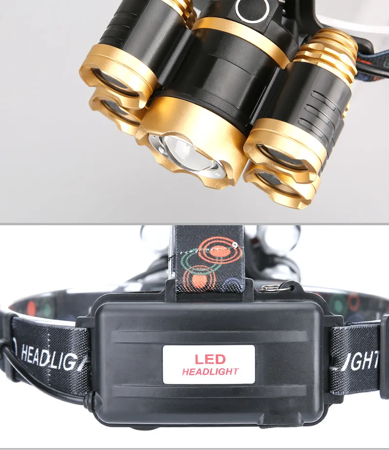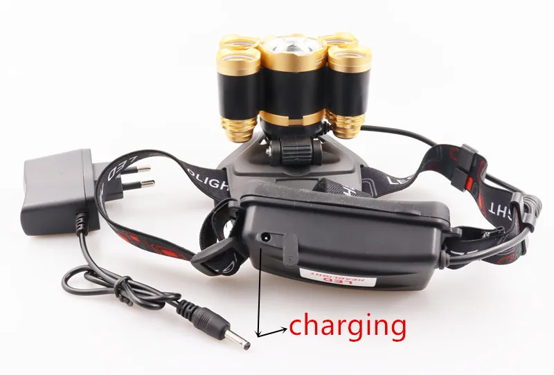 Features: Internal wiring applies the high efficient booster circuit, working voltage is wide and can utilize the batteries in the largest extent LED indication of the charging adapter for Power On / Charging / Full charge Extensive Lifetime of LED (10,000 hours) Rechargable batteries and universal charger provided With adjustable base for your convenient use Perfect headlamp fits for outdoor activities, such as camping, traveling, hiking, etc. Specifications: Type: Headlamp,lamp Mode: 4-mode Number of LEDs: 5 LED Color: White 6000K Waterproof:YES,But can not put into water,it is not for diving. Switch Type: Button (On, Off and mode selecting) Material: aluminum, glass, plastic and cotten Powered by: 2 x 18650 Li-Lon 3.7V Battery Weight :about 210g