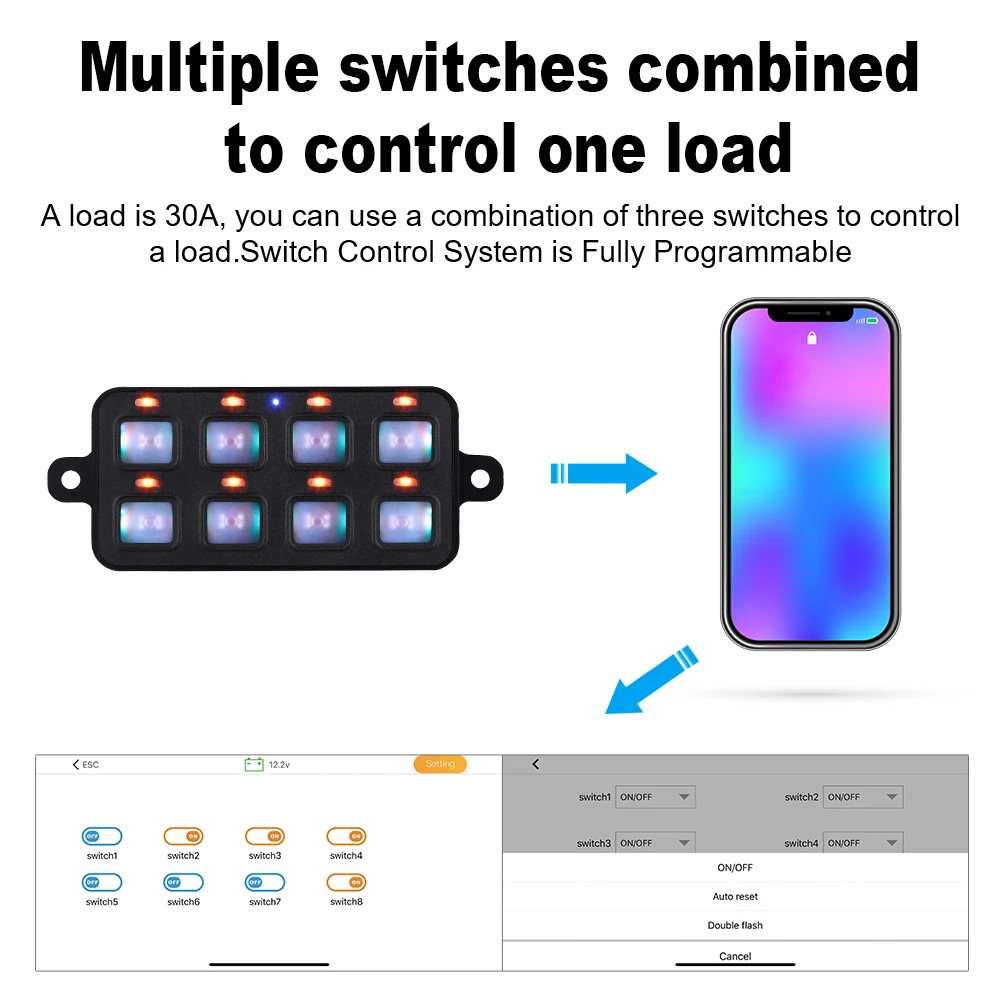 2. Несколько переключателей объединены для управления одной нагрузкой: если подключенный ток нагрузки слишком большой (один переключатель 120 Вт = 12 В * 10 А), когда один переключатель не перемещает одну нагрузку, вы можете использовать комбинацию нескольких переключателей для управления одной нагрузкой. Например, нагрузка 30A, вы можете использовать комбинацию из трех переключателей для управления нагрузкой. Система управления переключателем Полностью программируется. 8 выключателей могут быть установлены как вкл/выкл, двойная вспышка или мгновенный.