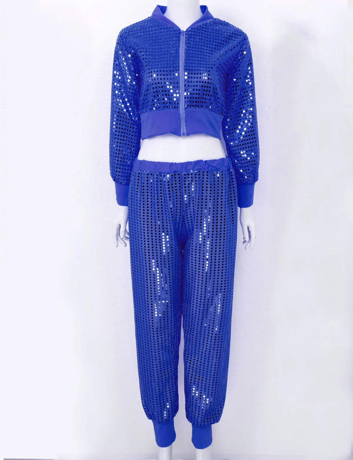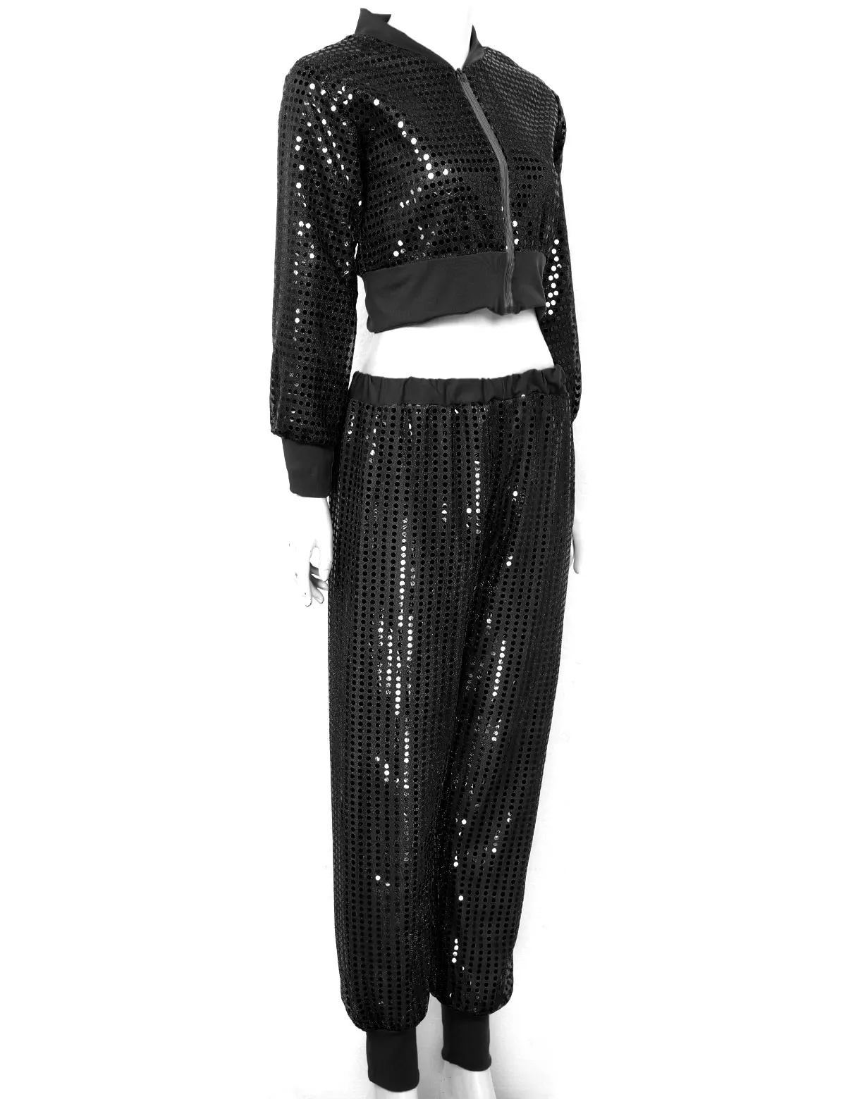 Женский костюм для джазового танца из 2 предметов с блестящими блестками, танцевальные костюмы в стиле хип-хоп для взрослых, укороченный топ с длинными рукавами и v-образным вырезом, штаны-шаровары