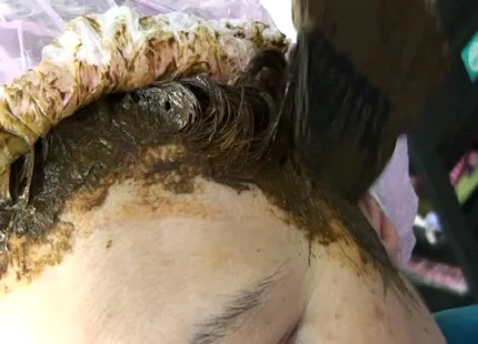 3. После того, как вся Чистка завершена, проверьте волосы, которые только что были почищены, и почистите неровные области. После нанесения на голову, вы можете добавить цвет к передней части лба, храмы и задняя часть шеи, чтобы сделать их равномерно окрашенными и, наконец, наденьте шапочку для душа и оберните волосы около 4 часов.