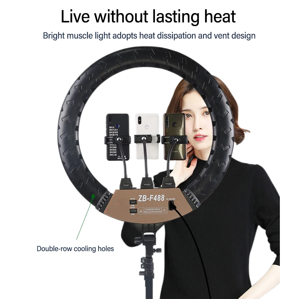 Технические характеристики: 1).10 режимов яркости. 2).3 вида цветов, плавное затемнение света, белый свет, теплый свет, мягкий свет. 3).2 м Регулируемая легкая подставка подходит для универсальной высокой и очень стабильной. 4). С студией для заполнения светового фото, портретный Автоспуск заполняет свет. 5). Кольцевая Светодиодная лампа для фотостудии с usb-разъемом. 6). Подходит для многих социальных, таких как макияж, видео в реальном времени, студийный свет, фотография. Описание: Название товара: видео селфи кольцо свет Зарядка: штекер адаптера переменного тока Тип: кольцевой светильник с подставкой/кольцевая лампа для макияжа Регулируемая подставка для штатива: 50-200 см Размер света: 55,5 см/22 дюйма Диаметр Цвет света: белый свет, теплый свет, мягкий свет Материал: алюминий + Поликарбонат Диапазон затемнения: 1%-100% Цветовая температура: 3200K-5500K Источник света: высококачественный светодиод SMD Мощность: 100W Светодиодные лампы: 600 шт. светодиодов Использование: продукт/рекламная фотография, прямая лампа заполняющая свет красоты, Макияж Видео Live Studio Упаковка включает в себя: 1/2/3/4: 1*22 дюймов селфи кольцо лампы (ЕС/США/Австралии/Великобритании) 1 * вращающейся головкой 1 * держатель телефона клип 1*200 см штатив-Трипод Упаковка включает в себя 5/6/7/8: 1 * селфи кольцевая лампа (ЕС/Великобритания/США/Австралия) 1 * головку колыбели 1 * держатель телефона клип Обратная связь: 1. Пожалуйста, оставьте положительный отзыв после получения посылки. 2. Если у вас есть какие-либо проблемы, просто свяжитесь с нами.