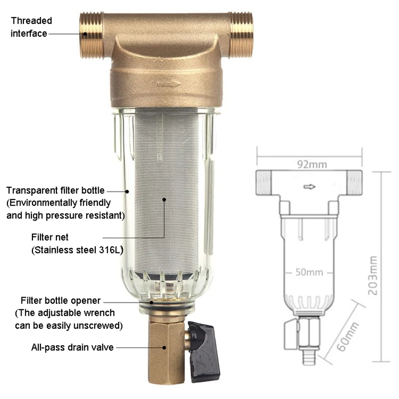1. Установка: предварительно фильтр должен быть установлен перпендикулярно трубопроводу, дренажный шаровой клапан отверстие вниз. Направление стрелки на корпусе клапана указывает направление