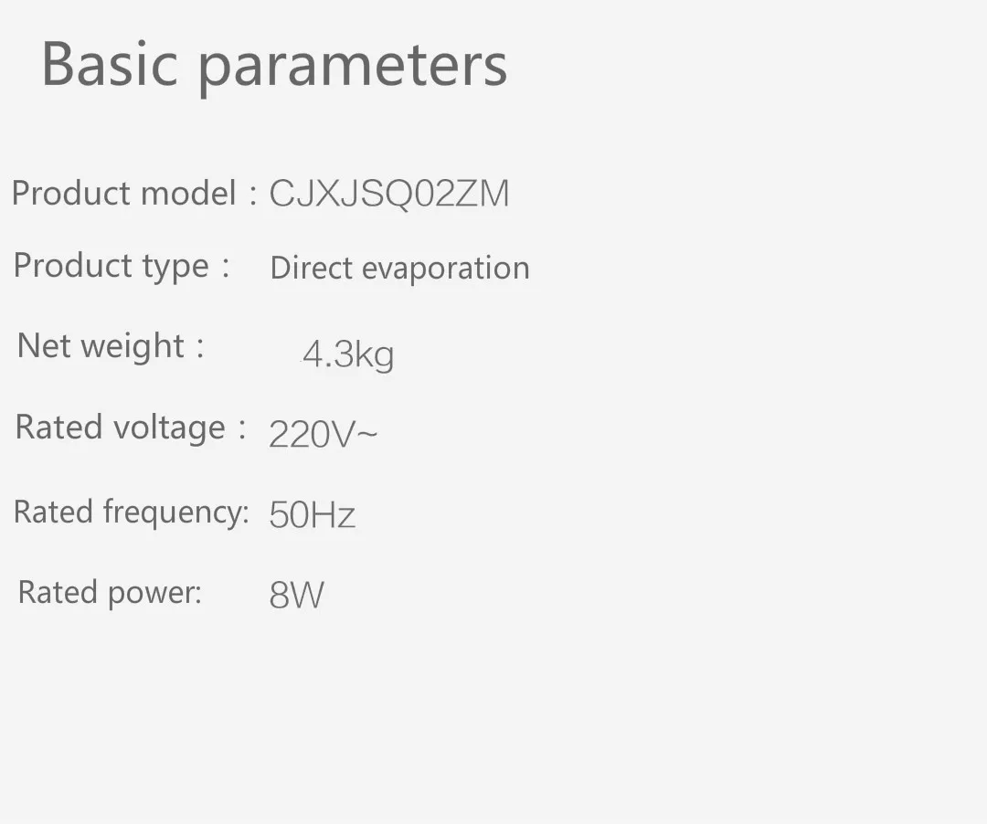 * Натуральный Испарительный Увлажнитель. * 4.0L Большая Емкость резервуара для воды. * Удобно вводить воду, она может работать 16 часов. * Автоматическое обнаружение воздуха, умное увлажнение, дистанционное управление мобильным приложением. * Устройство для переключения времени. * Интеллектуальная Множественная защита безопасности. Модель продукта: CJXJSQ02ZM Тип товара: прямое испарение Вес нетто: около 4,3 кг Номинальное напряжение: 220 В Номинальная частота: 50 Гц Номинальная мощность: 8 Вт