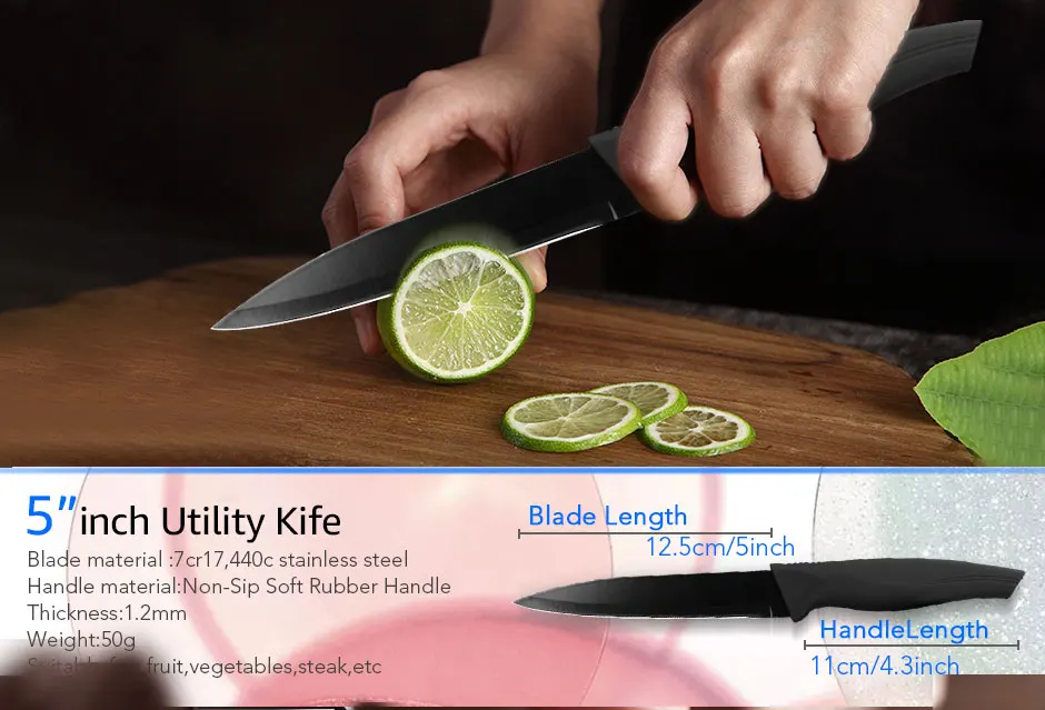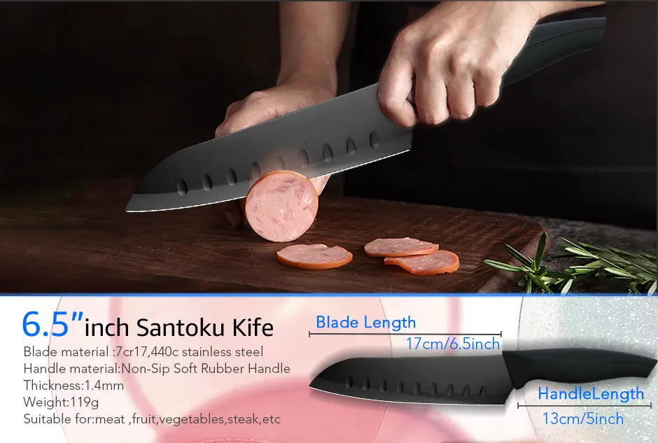 1. Материал лезвия: X50CrMov15 высокоуглеродистая Нержавеющая сталь 2. Твердость лезвия: 56- 58 HRC 3. Поверхность лезвия: Черное антипригарное окислительное покрытие, без ржавчины! 4. Материал ручки: Высококачественная Нескользящая ручка ABS + мягкое покрытие TPR * Примечание: Каждый нож имеет защитную пластиковую крышку ножа *