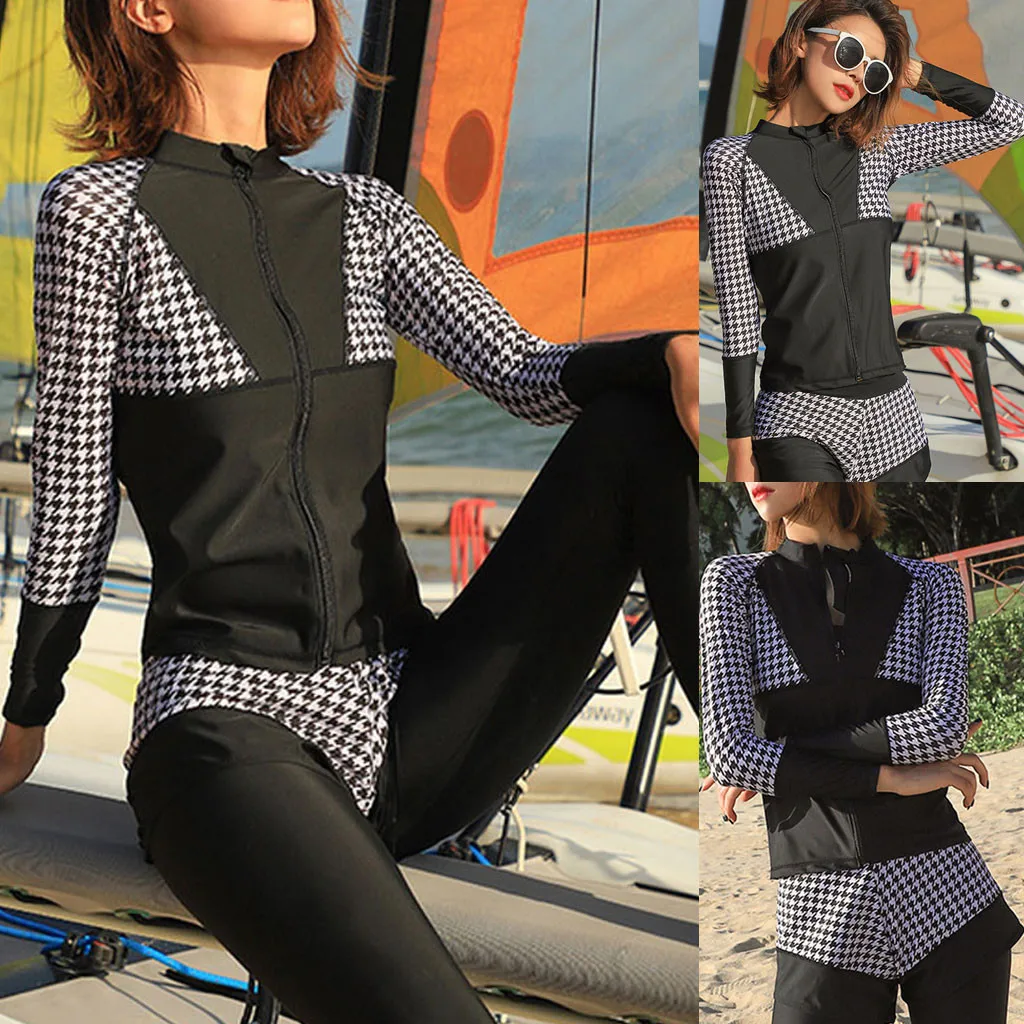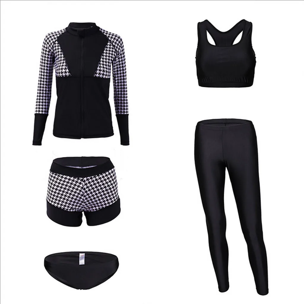 В комплект входит: 1 купальник с длинными рукавами + 1 купальник без рукавов + 2 купальных штанов + 1 трусы