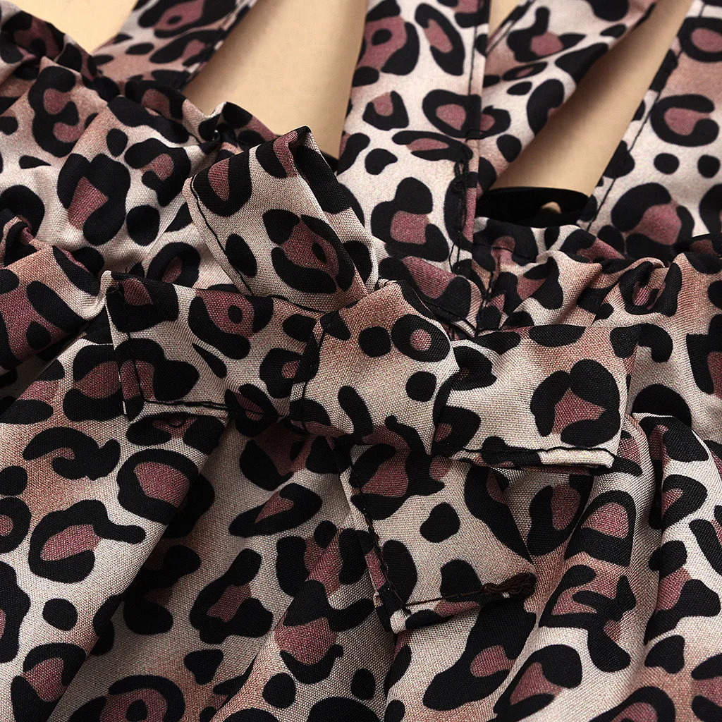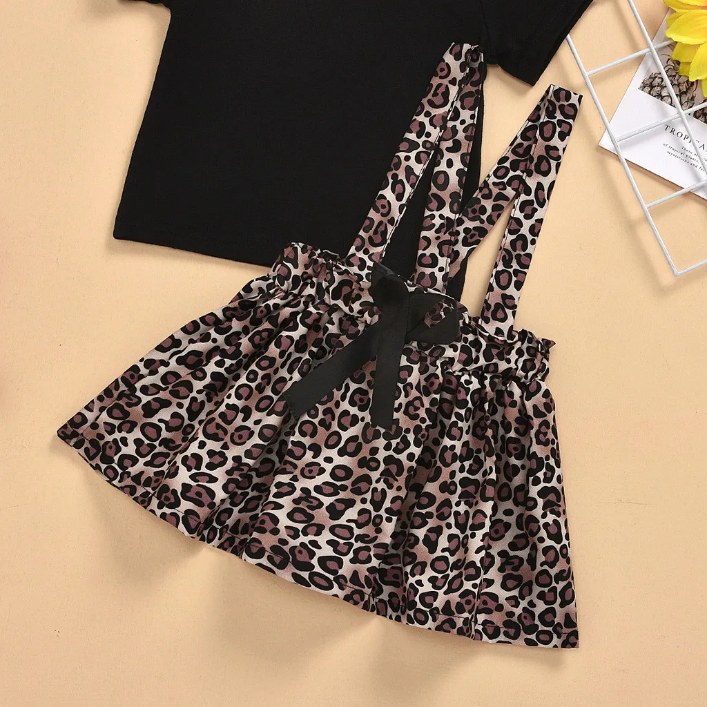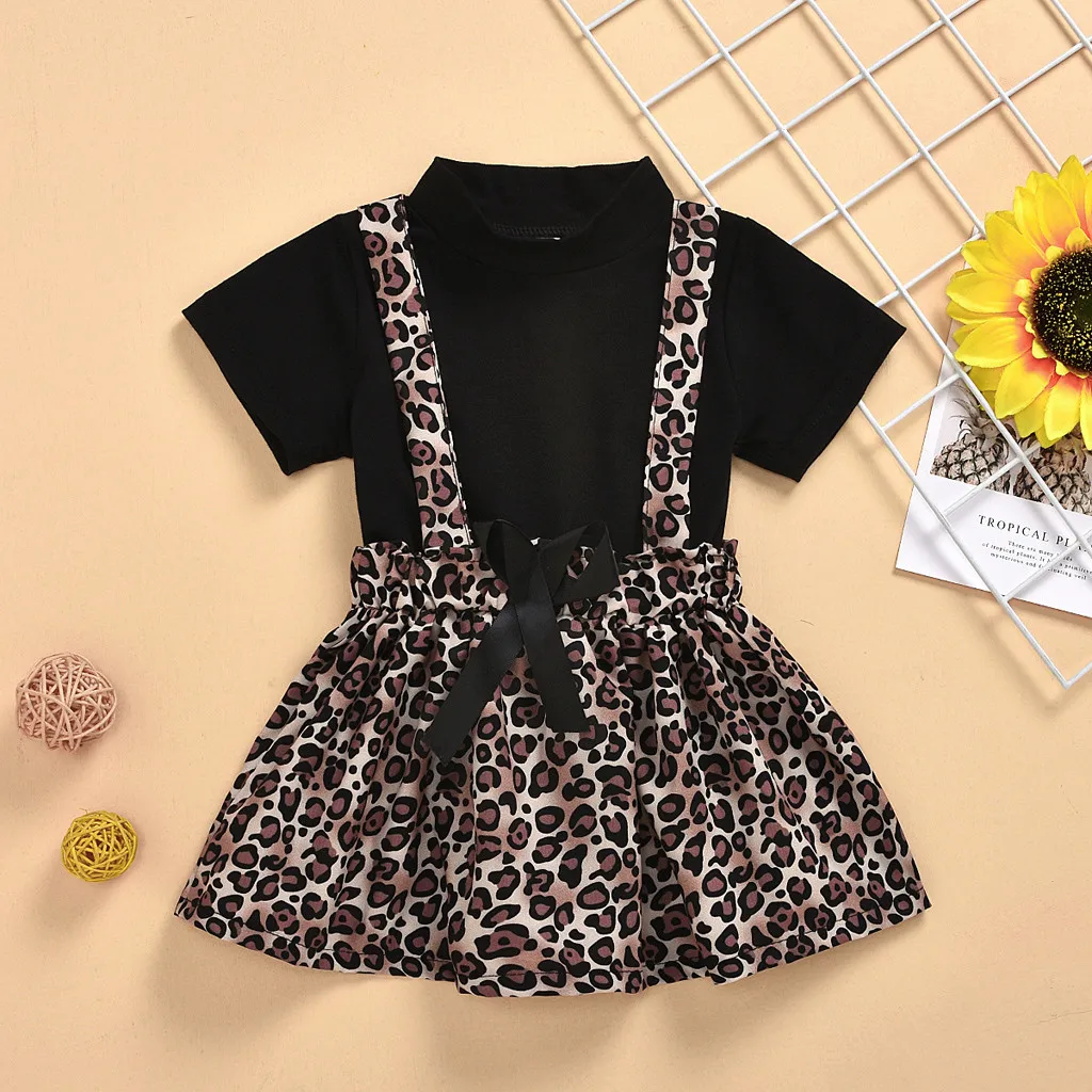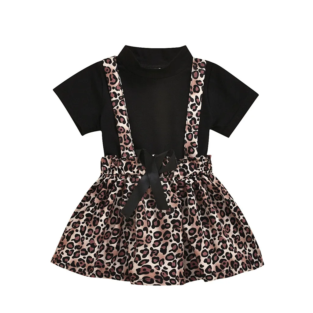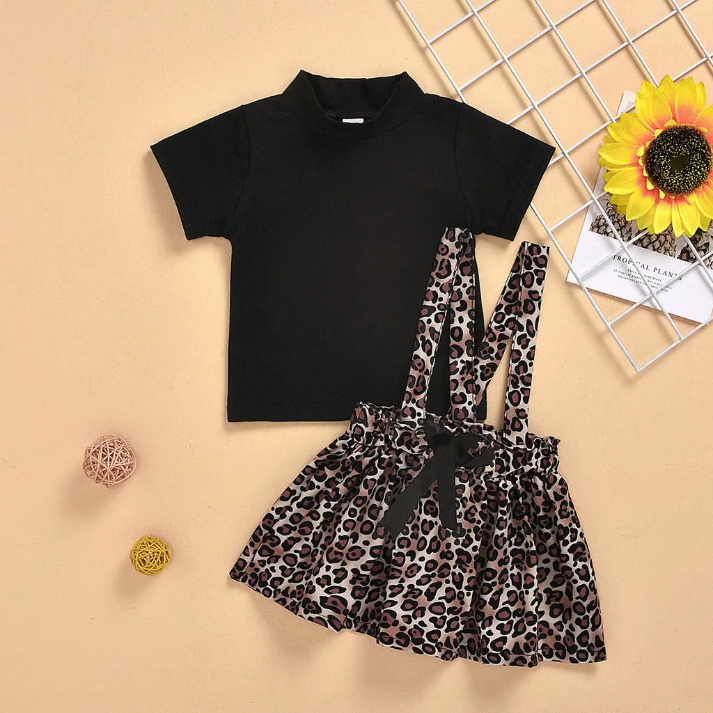 Однотонная футболка для маленьких девочек; Комплект с юбкой на подтяжках с леопардовым принтом и бантом
