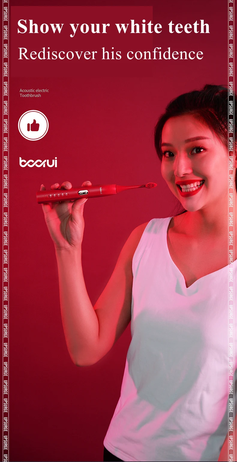 Название продукта: электрическая зубная щетка BOORUI Sonic Материал головки зубной щетки: DuPont Класс водонепроницаемости: IPX7 Децибел: менее 50 дБ, очень тихий Частота вибрации: 31000-42000 раз/мин Время зарядки: 6 часов Время работы: 2 раза в день, может длиться более 5 недель Параметры зарядки: DC5V, 130mA Режимы очистки: A. Чистый B. Белый C. Уход за деснами D. Массаж Преимущество: 2 минут смарт-таймер 30 секунд напоминания об остановке Предотвращения кариеса Чистый и отбеливания зубов Свежее дыхание улучшает здоровье десен Высокая скорость звуковых волн В 6 раз чище, чем ручная Чистка США DuPont материал Зубная щетка головка, комфорт и не повреждает зубы 3 года, дизайн с передовой технологией Массажная электрическая зубная щетка, наслаждайтесь чисткой зубов. Комплектация: 1. Ручка зубной щетки * 1 2. Головка зубной щетки * 2 3. Зарядное устройство * 1