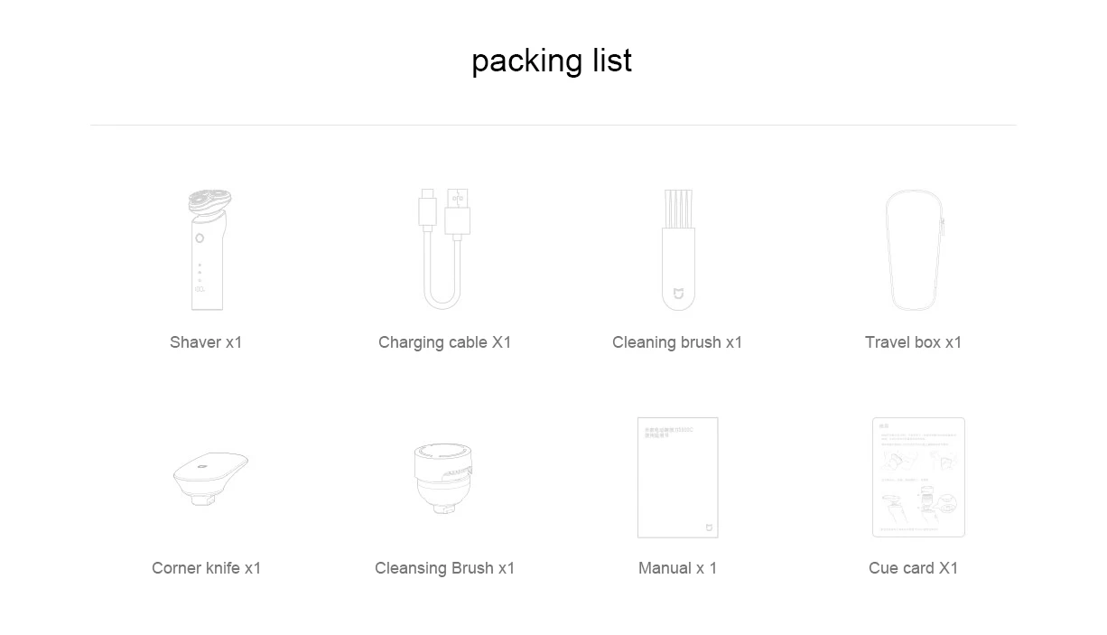 1 x электробритва, 1 x зарядный кабель, 1 x Чистящая Щетка