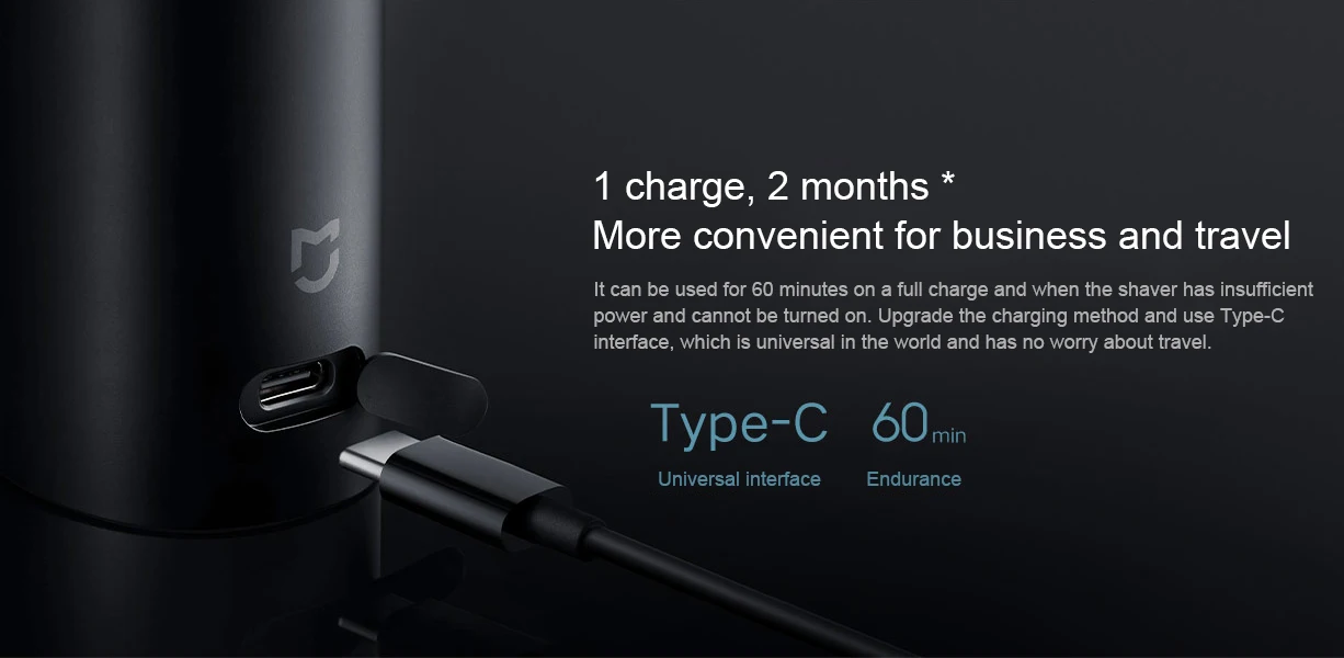 Он используется для 60 минут при полной зарядке и когда Бритва имеет недостаточную мощность и не может быть включена. Обновите метод зарядки и Используйте интерфейс Type-C, который является универсальным в мире и не беспокоится о путешествиях.