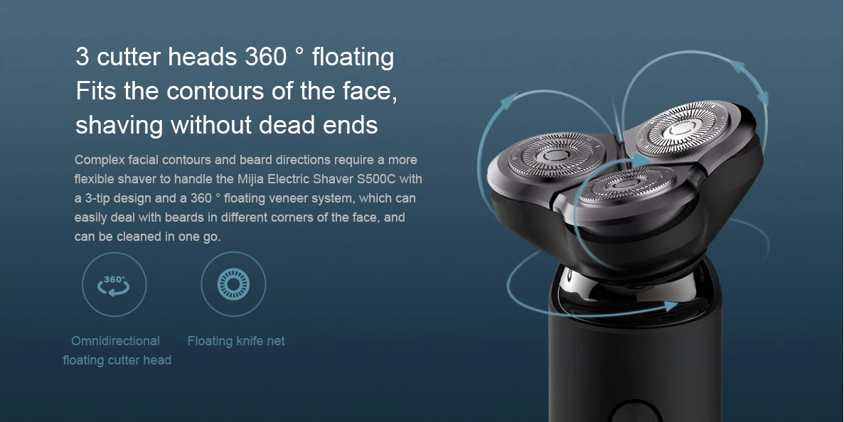 Mijia электробритва S500C имеет 3 лопасти, плавающие на 360 °. С двухслойными лезвиями бритье быстро и чисто. В то же время инновационное использование плавающей технологии делает процесс бритья более комфортным и гладким.