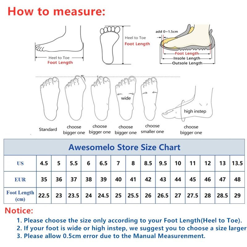 1. Разные страны или производители имеют различные стандарты размеров, пожалуйста, выберите размер только в соответствии с длиной Вашей стопы (от пятки до носка). 2. Если у вас широкая или высокая ступня, мы рекомендуем вам выбрать на размер больше. Если вы не уверены, пожалуйста, свяжитесь с нами. 3. Чтобы быстрее пройти ваш местный заказ, мы упакуем обувь «без коробки». Если вам нужна коробка, пожалуйста, обратите внимание отдельно или свяжитесь с нами. 4. Пожалуйста, проверьте правильность информации о вашем заказе, включая имя получателя, адрес доставки, номер телефона и почтовый индекс. 5. Если возникли какие-либо проблемы во время процесса покупок, время доставки или после получения товара, пожалуйста, свяжитесь с нами.